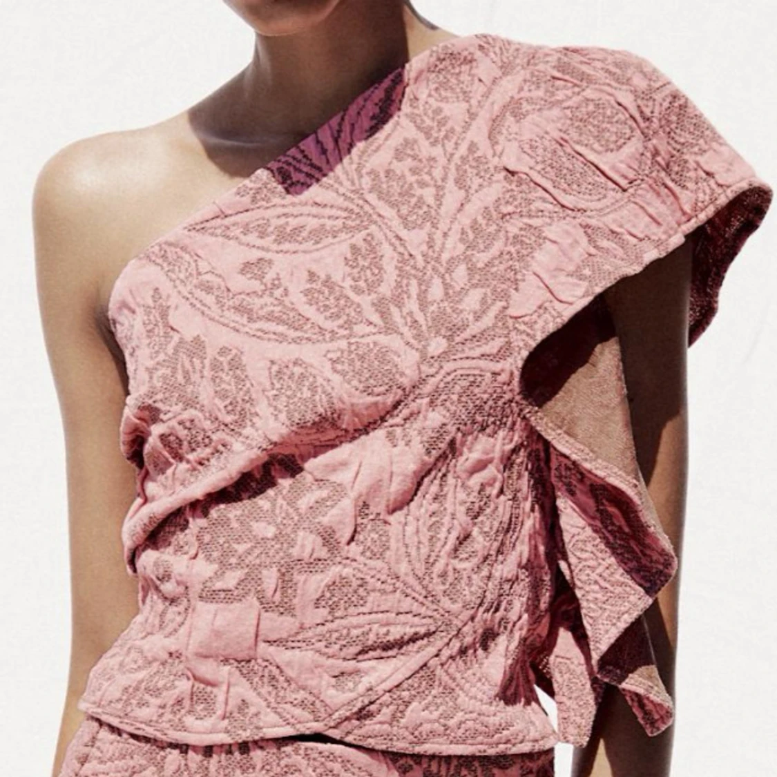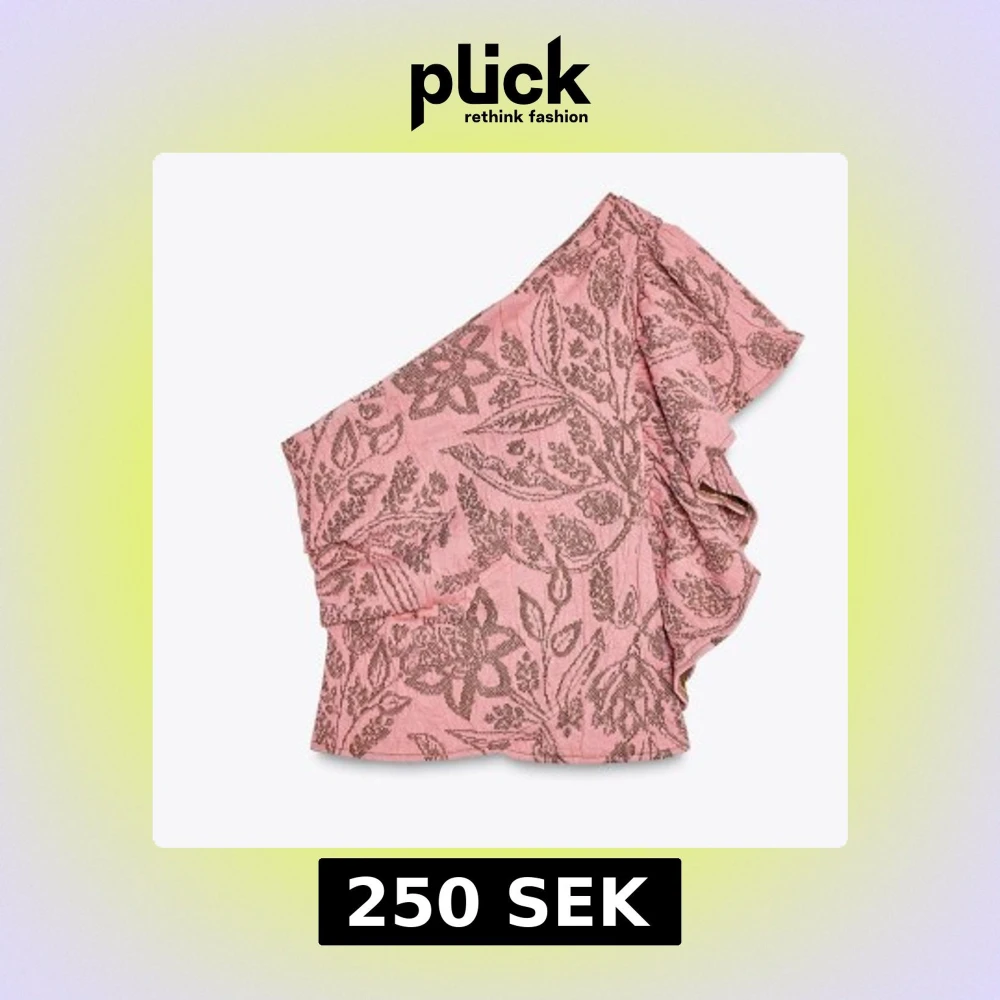 Superfin rosa blus med blommigt mönster och volangdetalj på ena axeln. Toppen har oneshoulder-design och är figurnära med snygg struktur i tyget. Perfekt för dig som vill sticka ut med en unik och trendig look.
