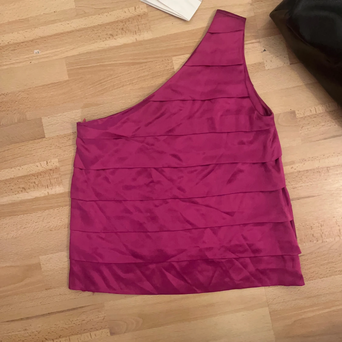 Säljer en snygg rosa oneshoulder topp med breda vågiga volanglager då den tyvärr är för stor för mig. Toppen har en glansig satinlook och är perfekt för dig som vill sticka ut. Den är ärmlös och har en asymmetrisk axel, vilket ger en cool och modern vibe. Perfekt till fest eller tjejkvällar!