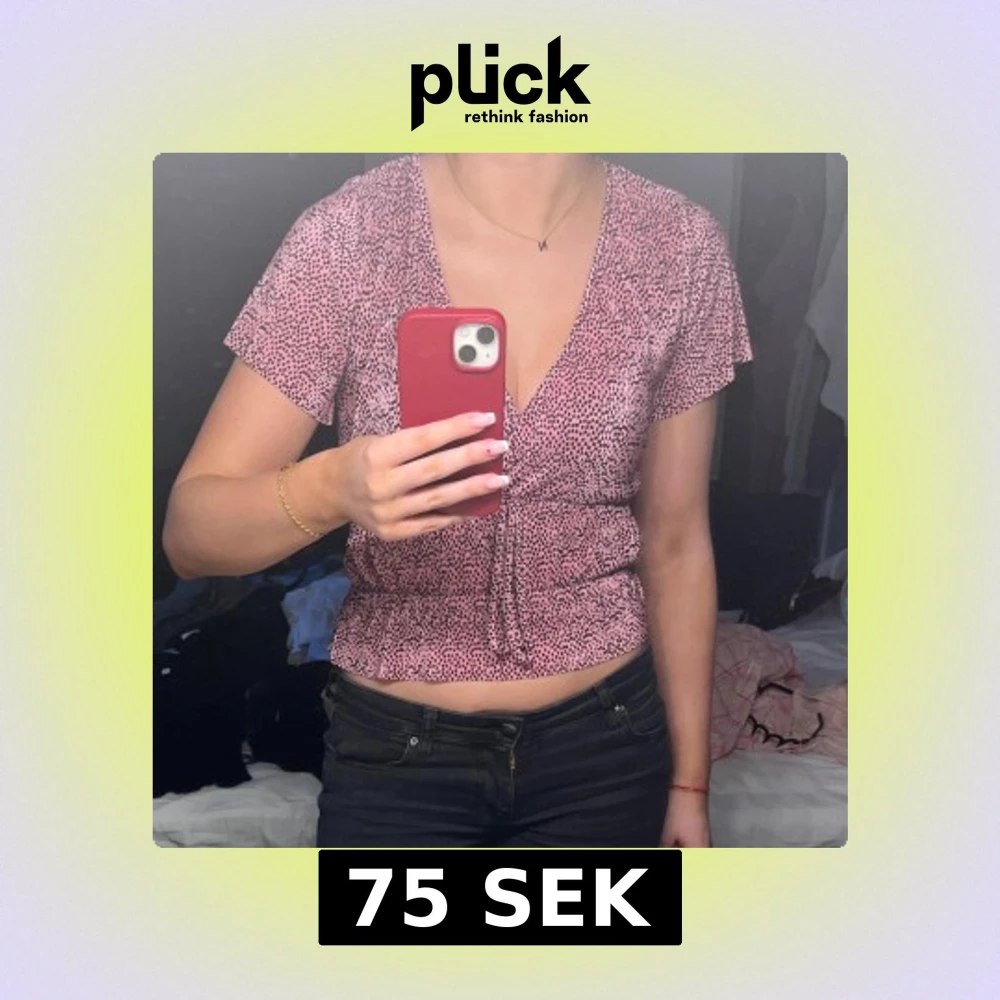 Säljer en rosa omlottopp med små svarta prickar. Toppen har korta ärmar och är v-ringad. I storlek S❣️