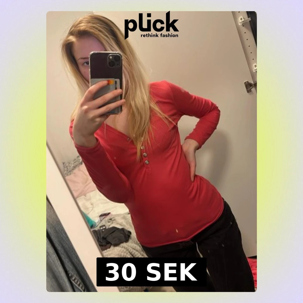 Säljer en rosa långärmad topp med v-ringning och knappar framtill. Toppen är ribbad och har en slim passform som framhäver figuren. Perfekt för att skapa en snygg och enkel look.