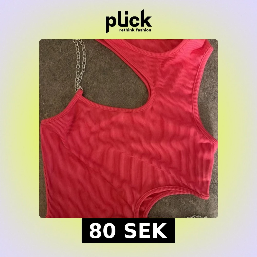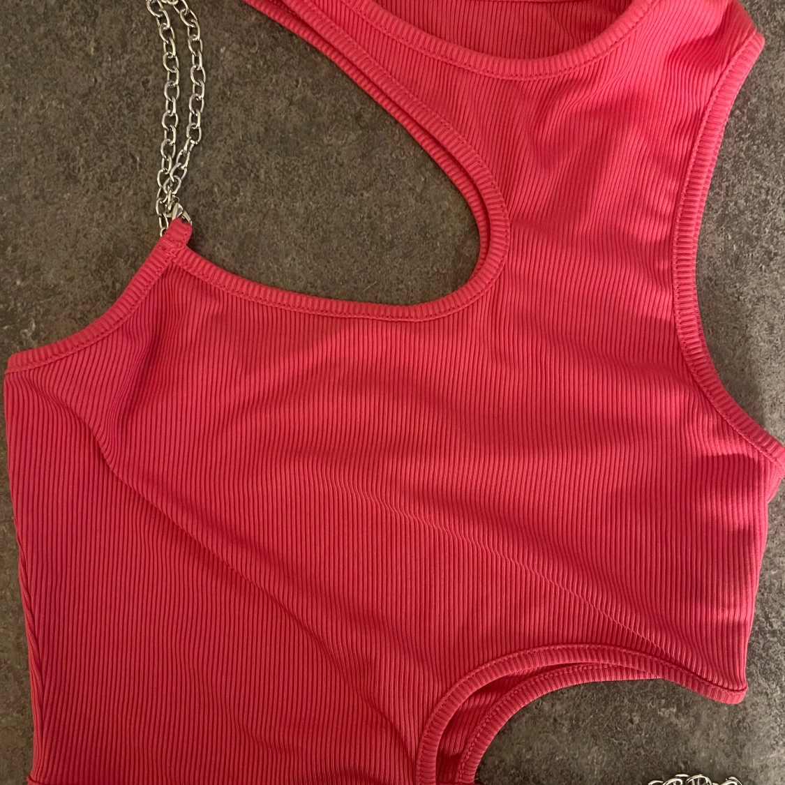 Snygg rosa magtröja med ribbad struktur. Ena axelbandet är ersatt med en silverfärgad kedja. Och en kedja vid midjan.