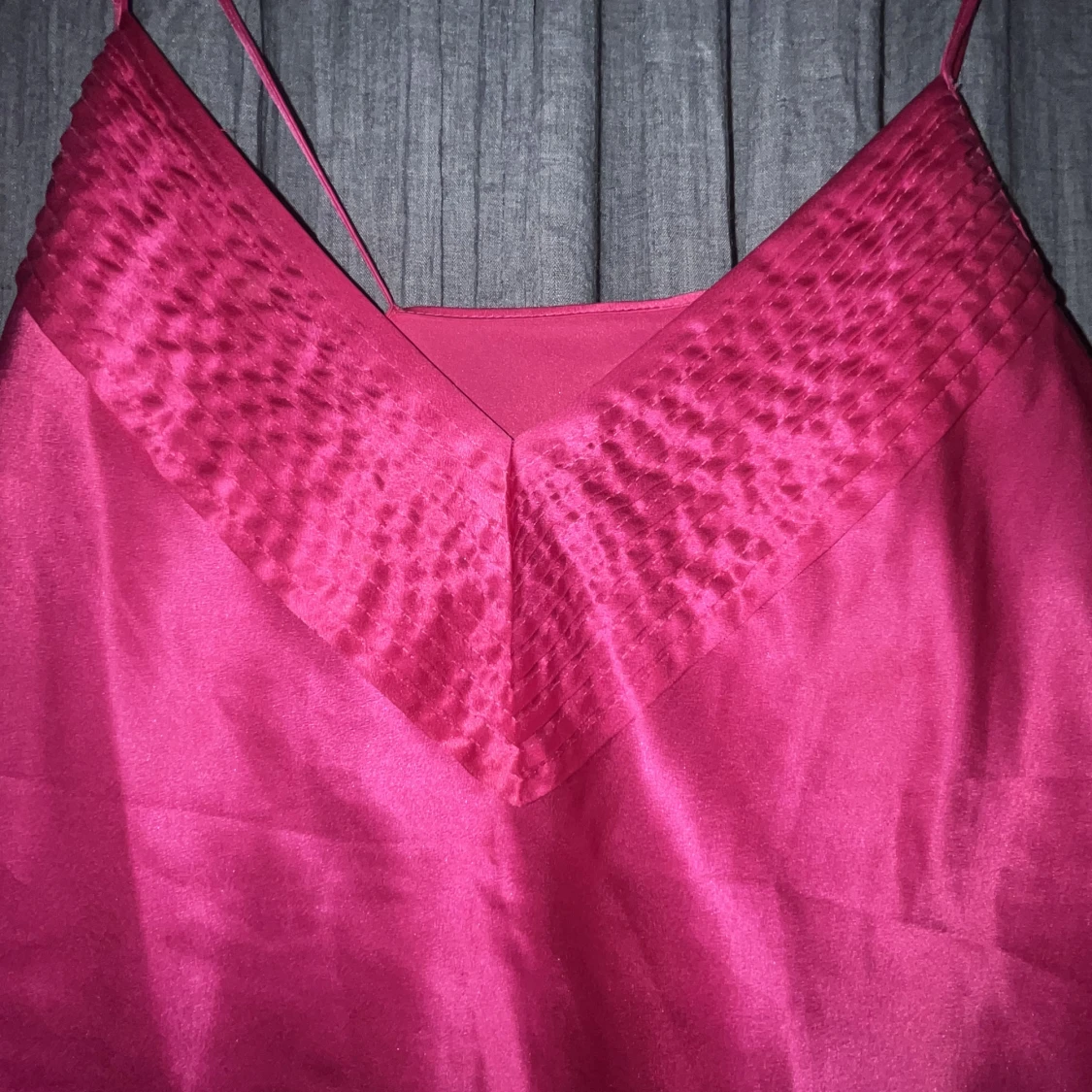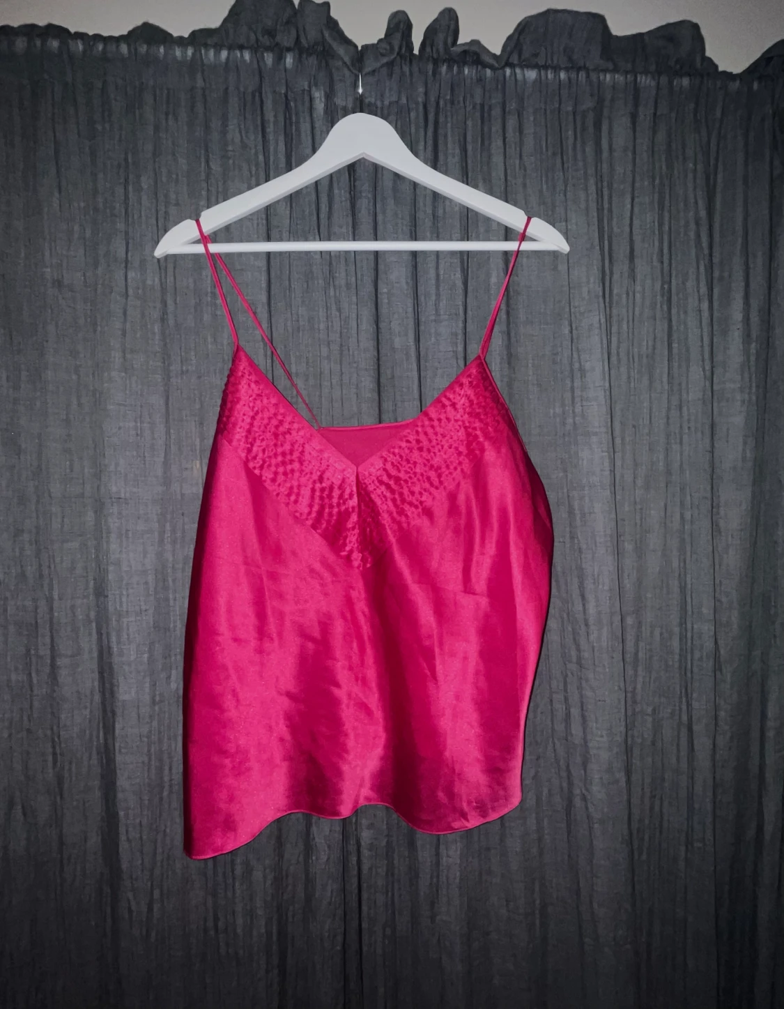 Ursnyggt glansigt siden linne i en mörkare rosađ. Toppen saknar mĂ€rke och Ă€ven storlek, men skulle uppskatta storleken som M (men beroende pĂ„ hur man vill att plagget ska sitta kan det passa frĂ„n S- L)