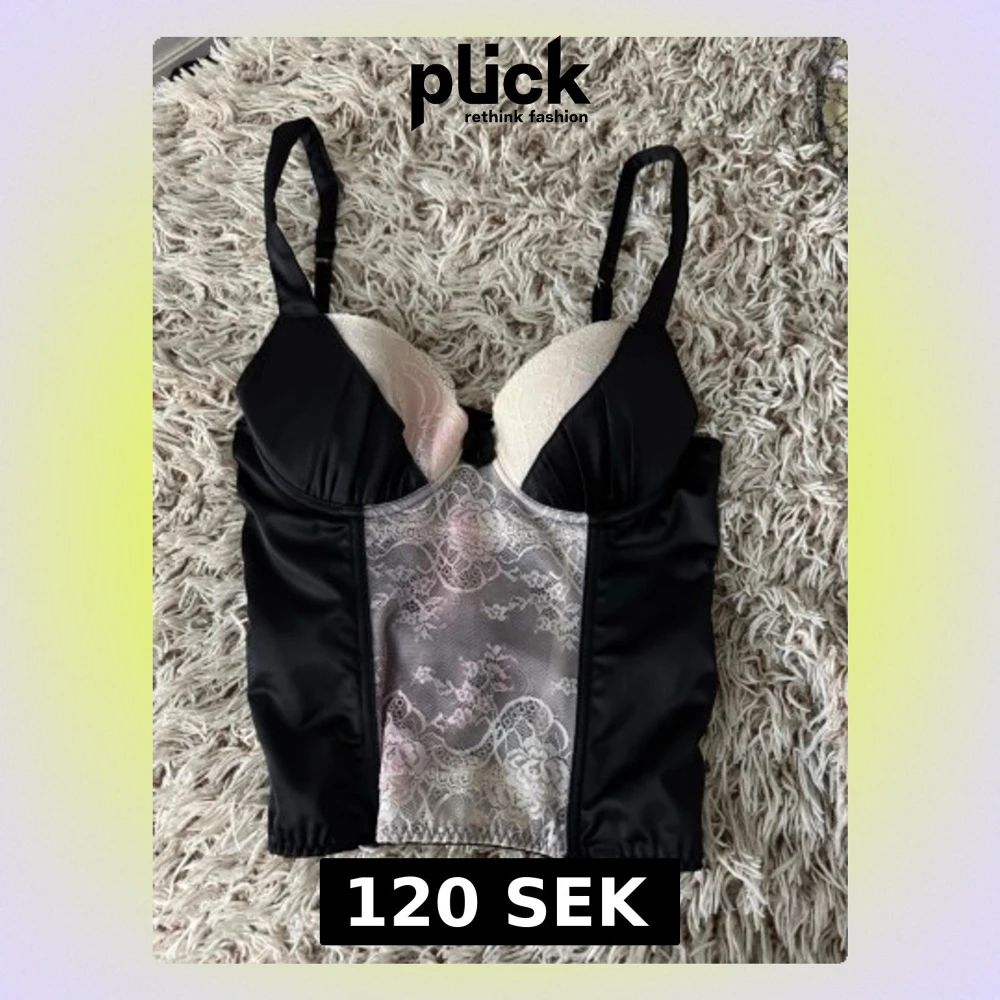 Snygg korsettopp i svart och vit med spetsdetaljer och vadderade kupor. Toppen har justerbara axelband och en liten svart rosett framtill. Perfekt för att skapa en chic och edgy look.