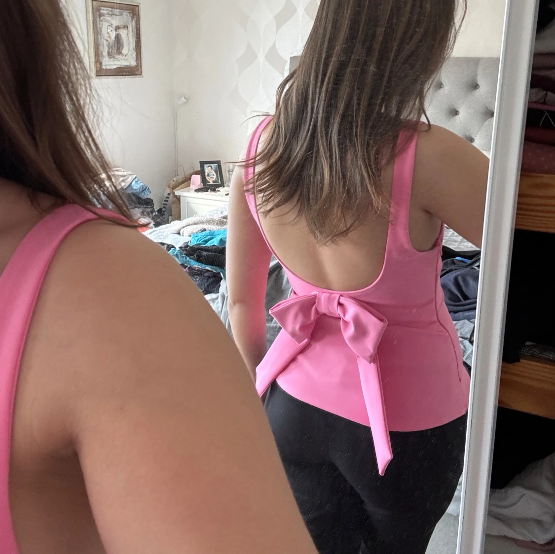 Säljer denna top med rosett i ryggen. Toppen har en tight passform och är perfekt för en festlig look. Helt oandvänd bara testad