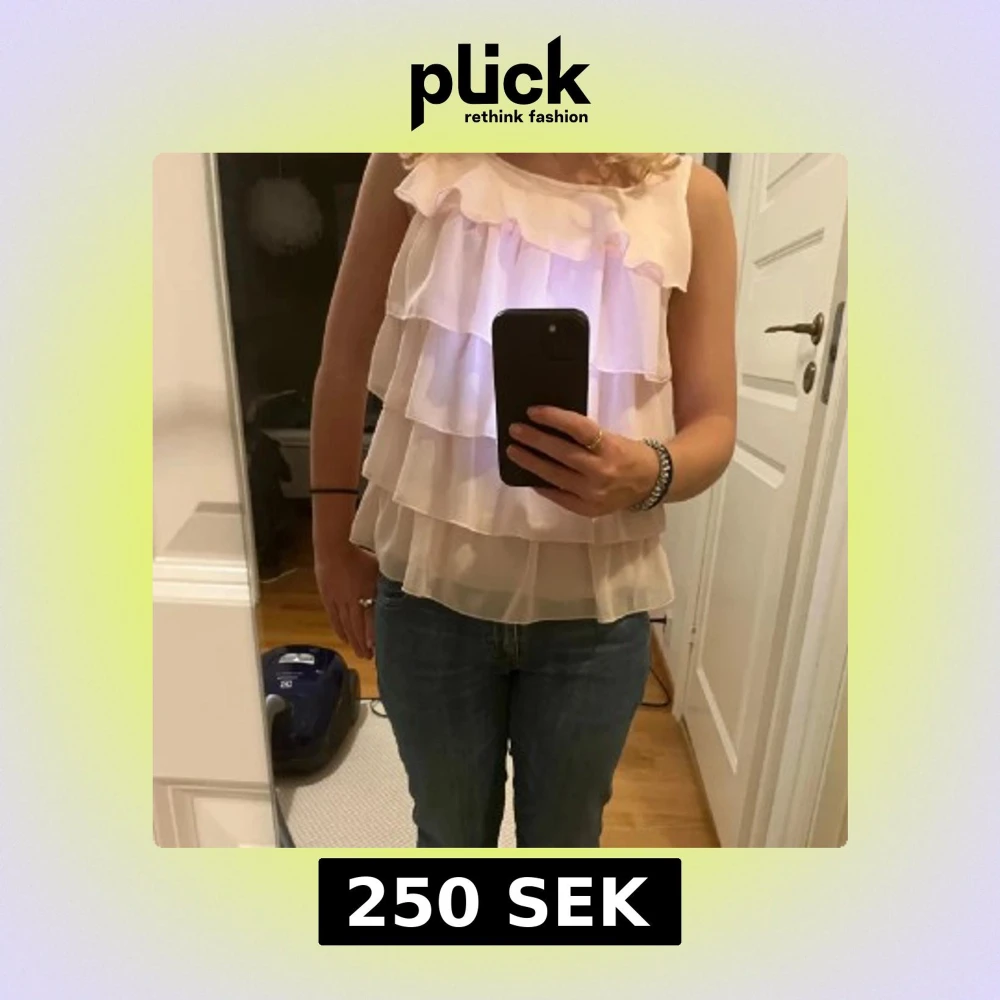 Säljer en söt rosa blus med flera lager av volanger. Blusen är ärmlös och har en luftig passform, perfekt för varmare dagar. Den är gjord i ett lätt och bekvämt material.