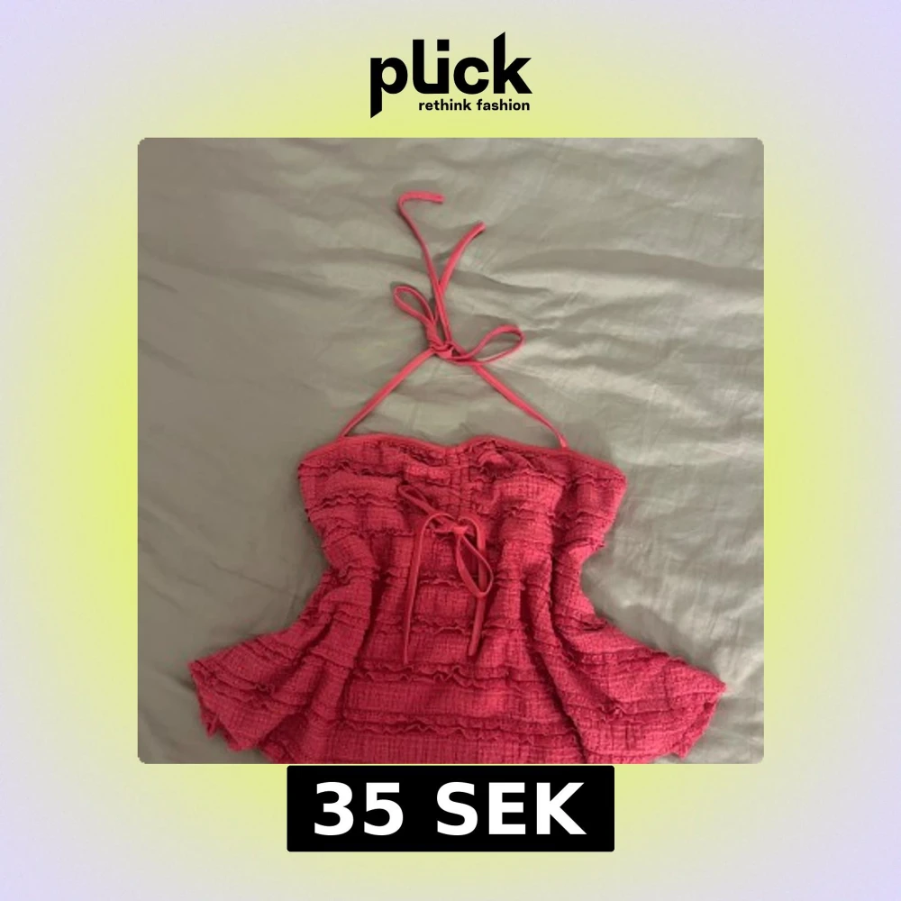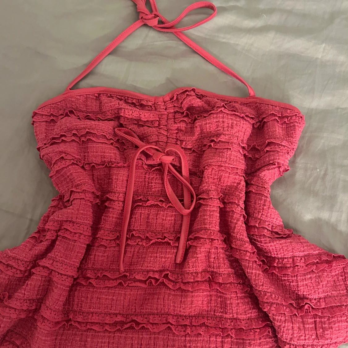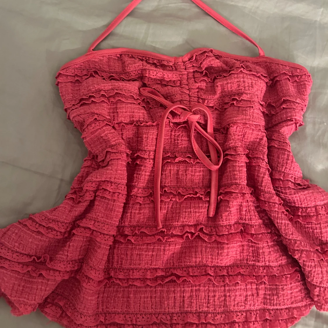 Supersöt rosa tubtopp med halterneck och volanger i flera lager. Toppen har knytband både i nacken och framtill, vilket ger en extra detalj. Materialet är lätt och strukturerat, perfekt för varma dagar eller när du vill sticka ut lite extra.