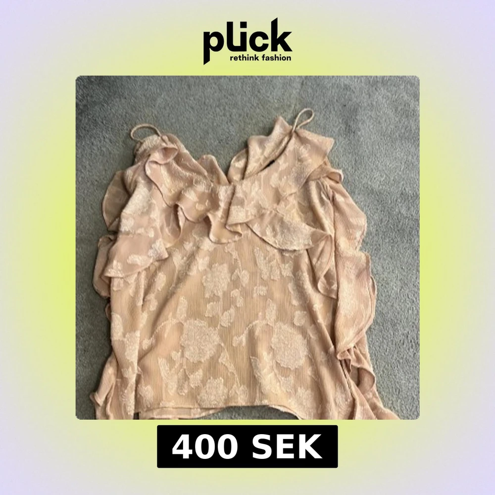 Supersöt blus från Zara i beige med blommigt mönster och volangdetaljer längs axlar och halsringning. Blusen har en lätt glansig yta och tunna axelband, perfekt för dig som gillar romantisk stil. Materialet känns lätt och luftigt.