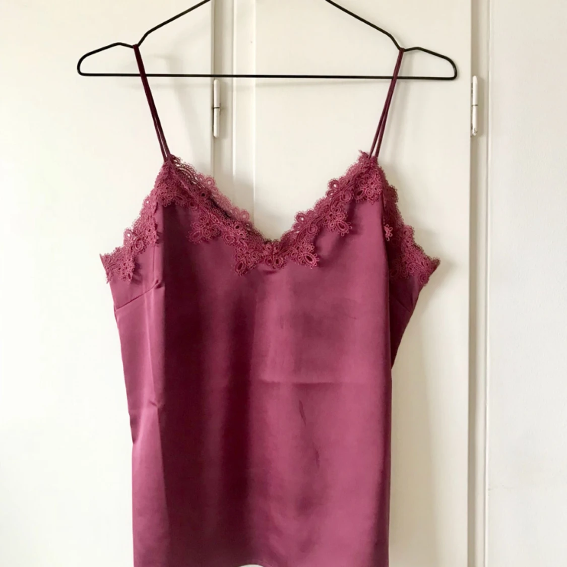 Superfin gammelrosa topp i semiglansigt tyg med söta spetsdetaljer. Säljes pga dubbelköp, så snygg till ett par svarta vida byxor på fest!