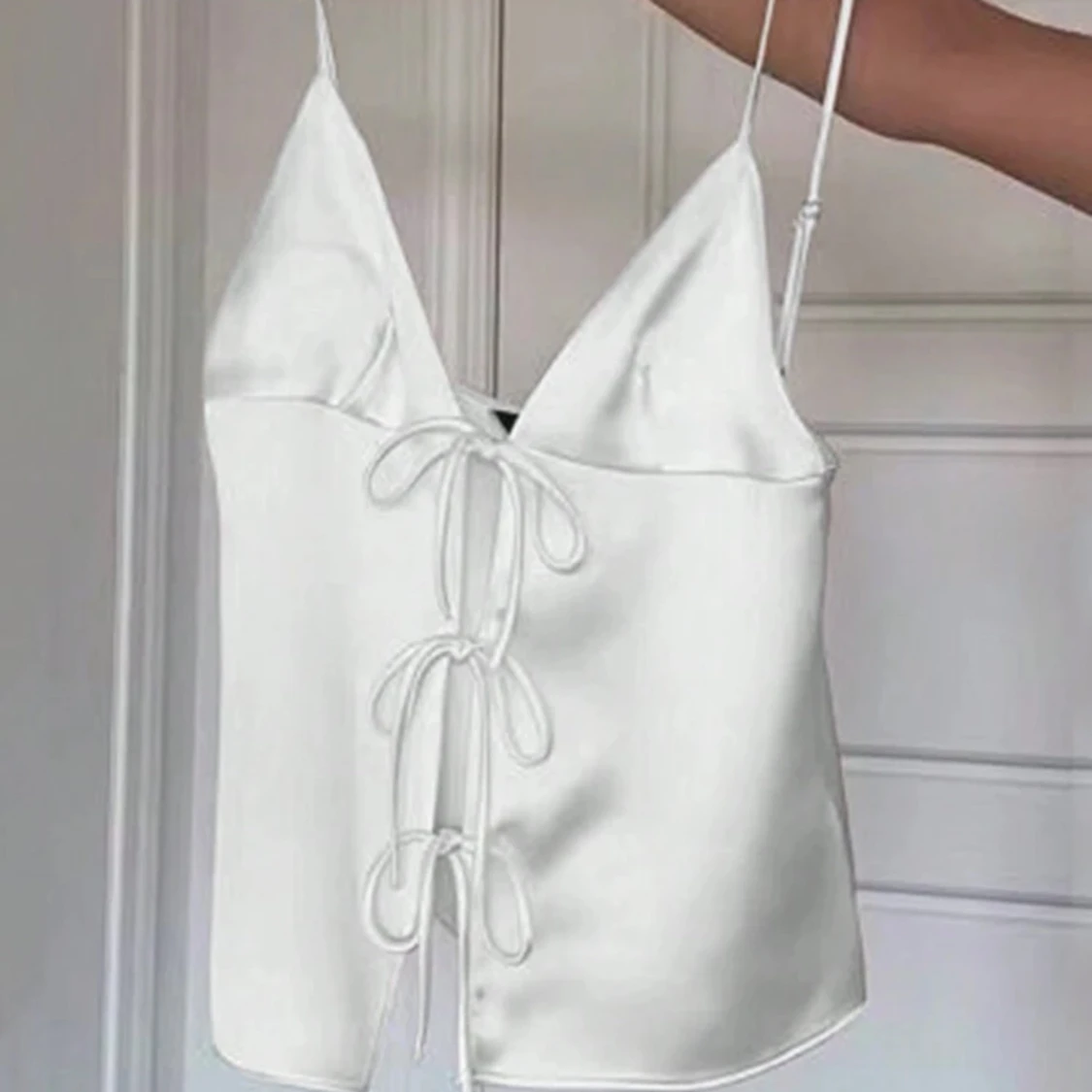 Elegant vit satinlinne med smala axelband och rosetter framtill. Perfekt sommar topp som går att klä upp fint🤍