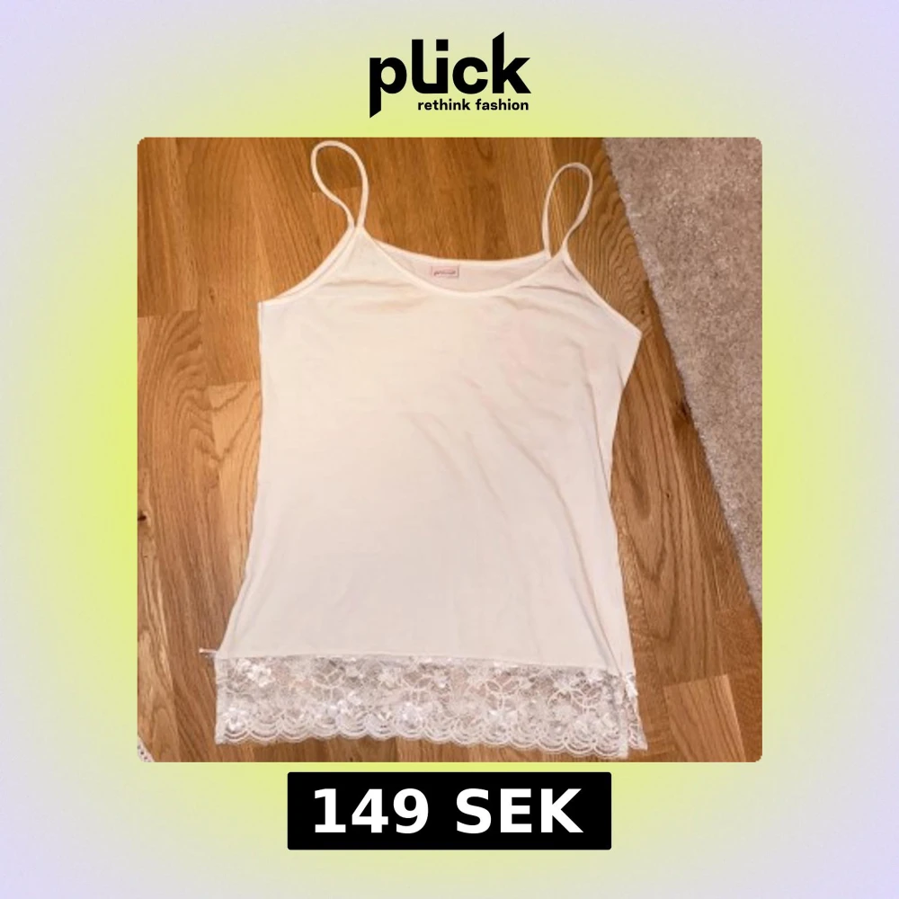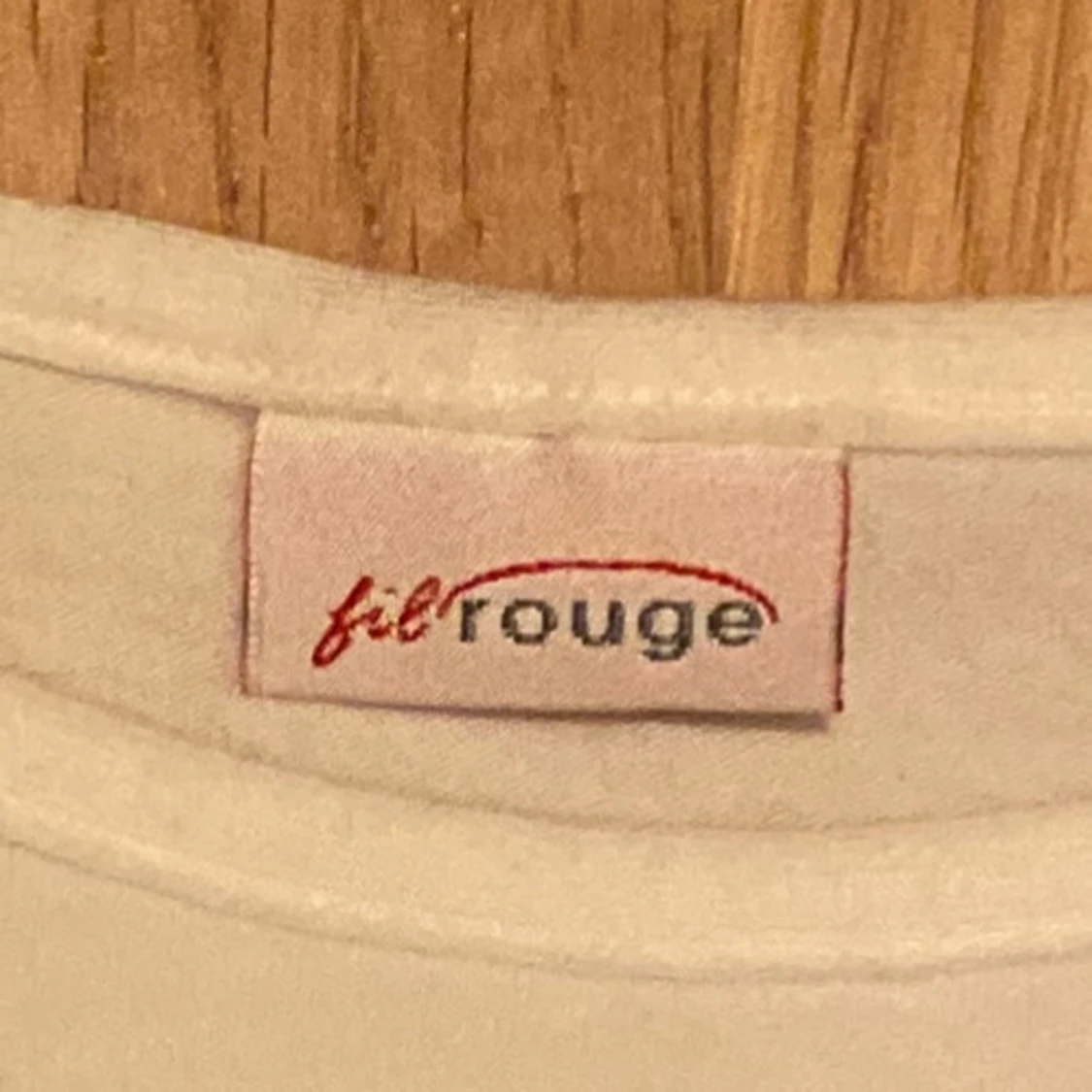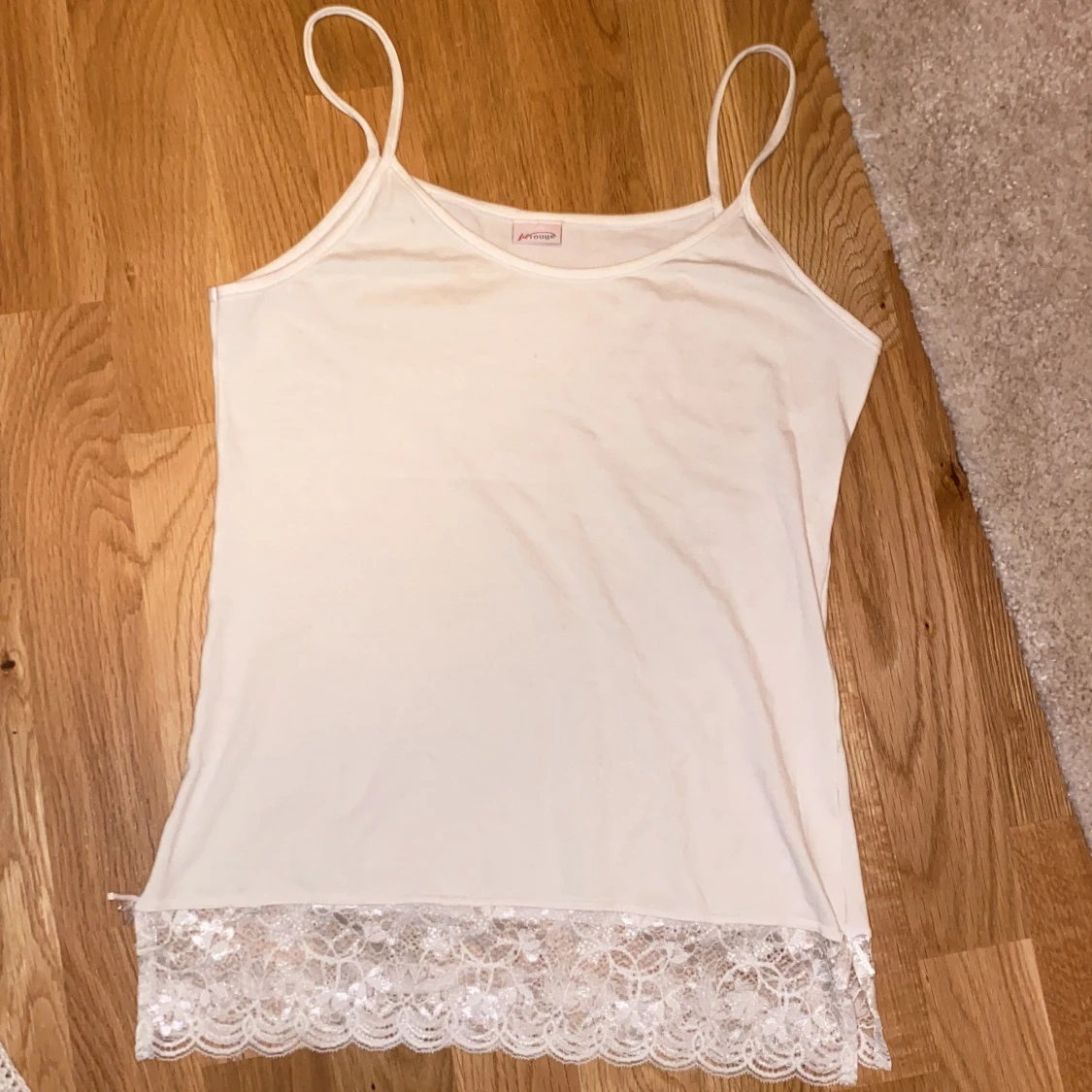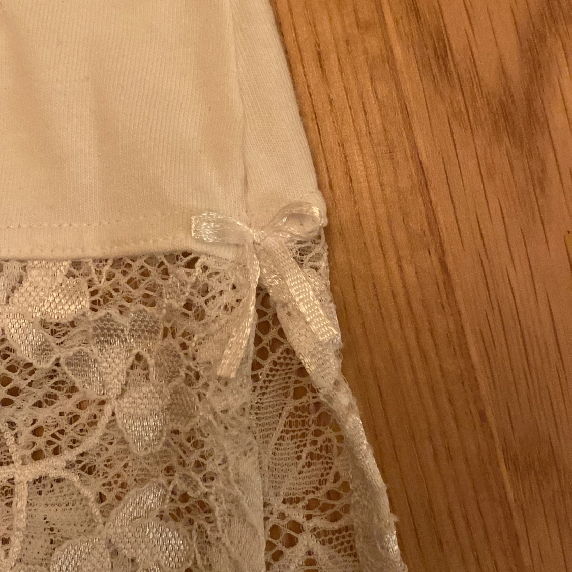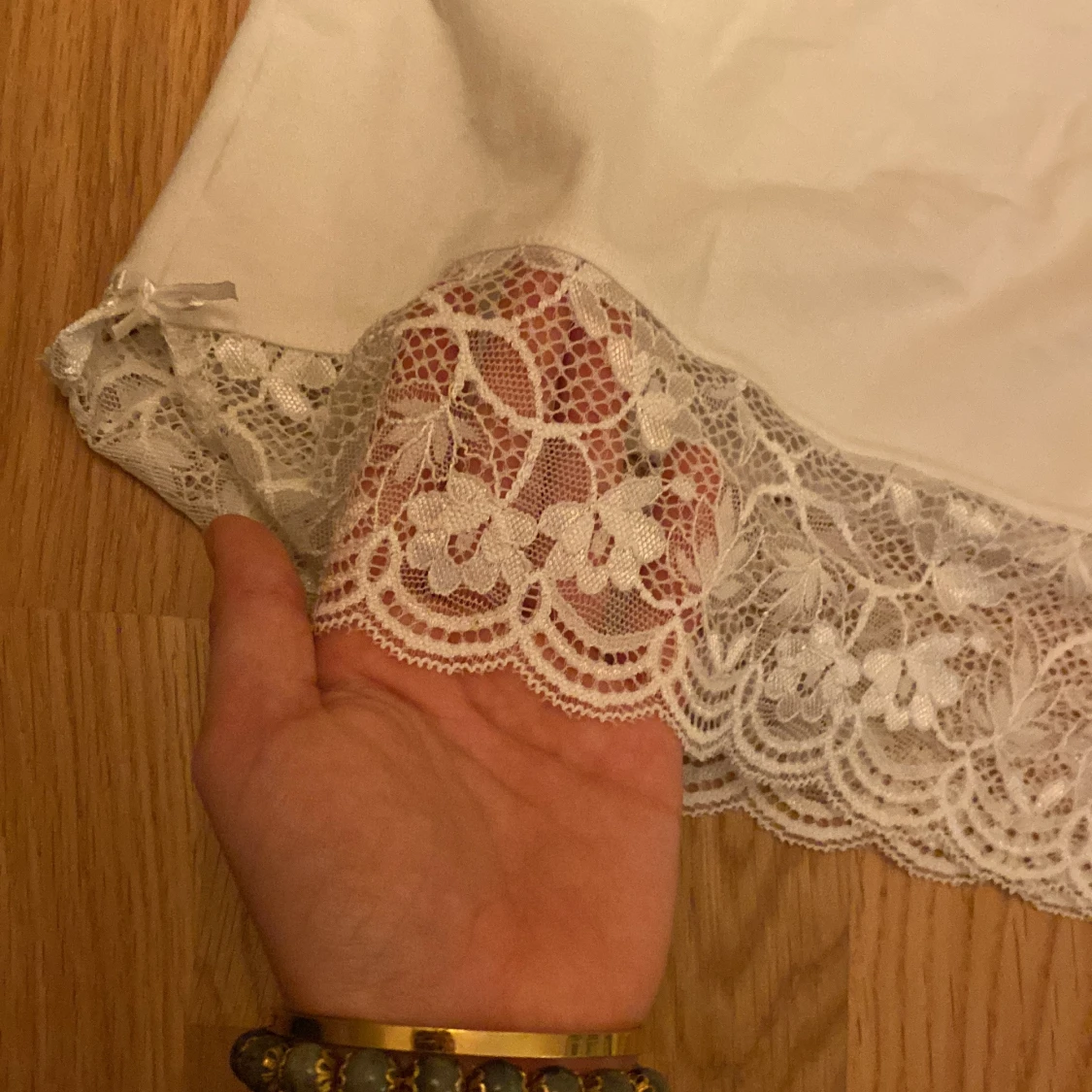 Vitt linne från Fil Rouge med tunna axelband och bred spetskant nertill. Spetsen har blommigt mönster och en liten rosett på båda sidorna för extra detalj. Liten sminkfläck på framsidan som knappt syns och säkert går att tvätta bort. Storleken står inte men skulle säga S/M