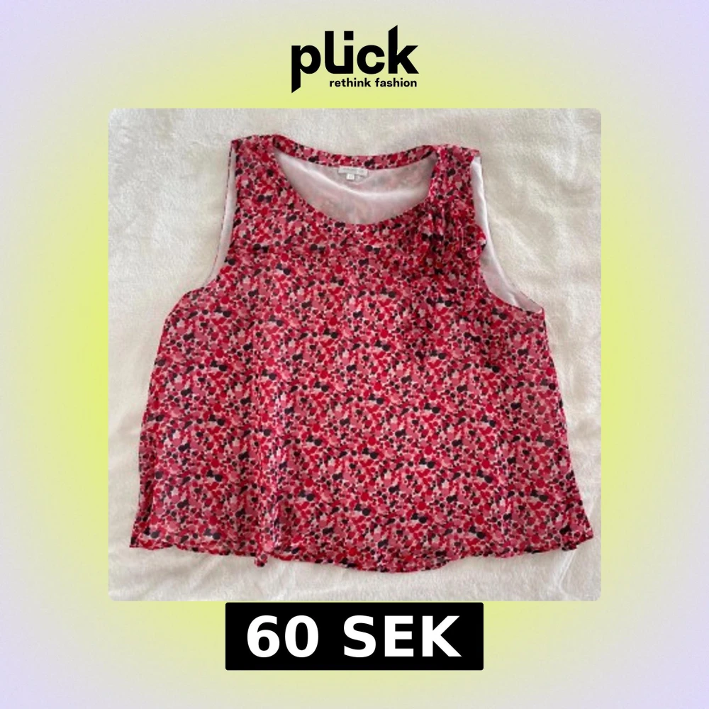 Säljer en luftig och ärmlös blus från Stockh LM med blommigt mönster i rött, rosa och svart. Blusen har en söt rosettdetalj vid halsen och är tillverkad i ett tunt, syntetiskt material. Perfekt för varma dagar!