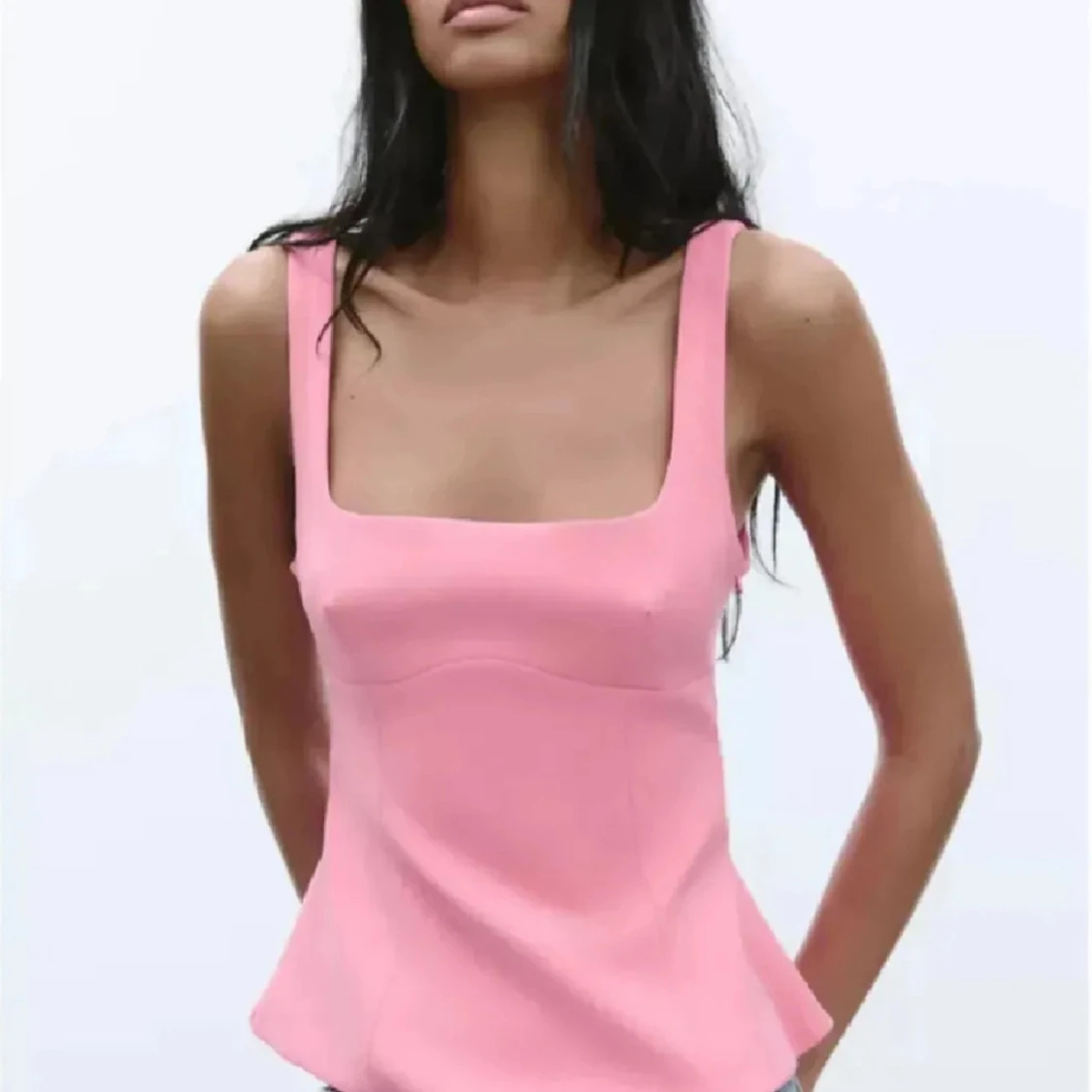 Supersnygg rosa linnetopp med breda axelband och fyrkantig ringning. Toppen har en figurnära passform upptill och faller lätt nedtill, perfekt för en trendig och fräsch look. Enkel att matcha med både jeans och kjol.
