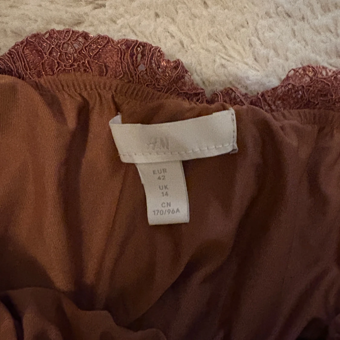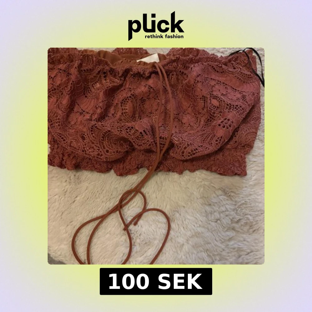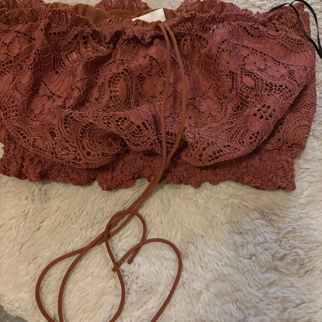 Superfin bandeau tubtopp från H&M i rostbrun färg med detaljerad spets och snörning framtill. Toppen är axelbandslös och har en croppad passform som ger en snygg siluett. Perfekt för dig som vill sticka ut med coola detaljer och unik look.