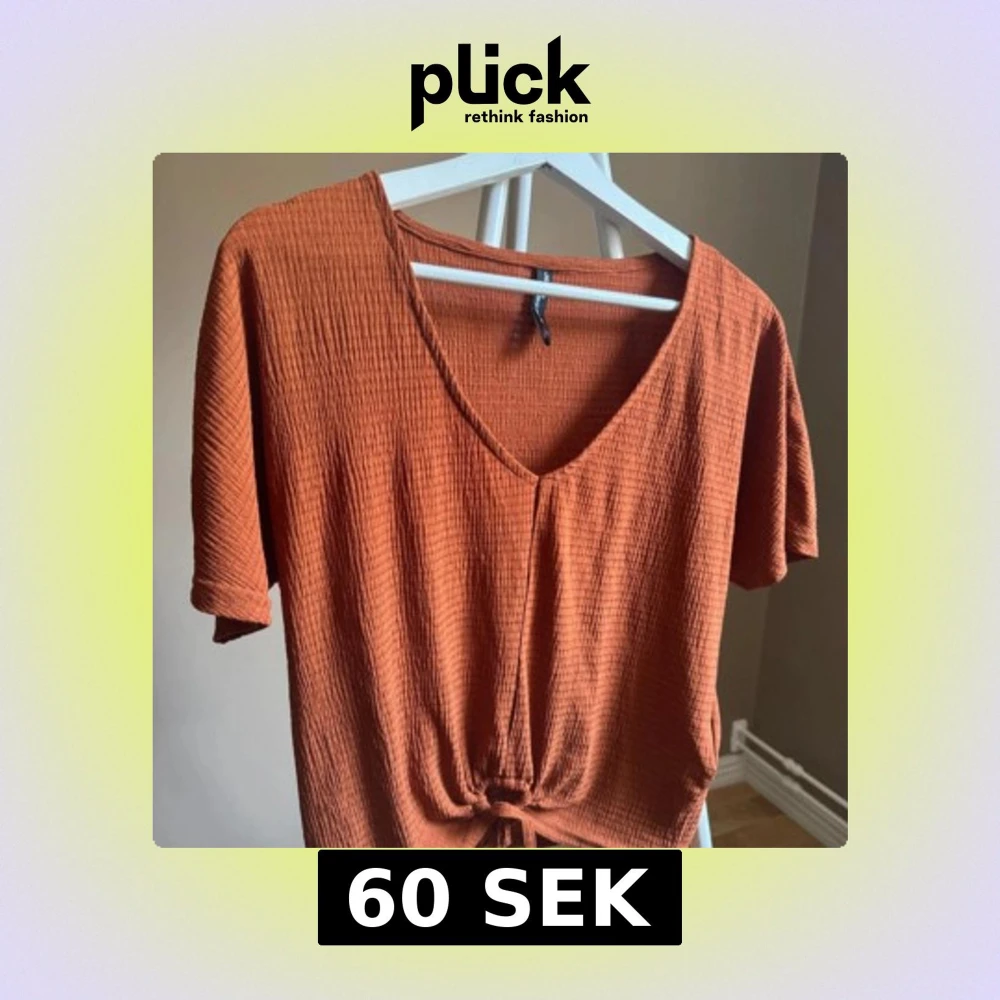 ❤️bilder från min Vinted ❤️Säljer en snygg rostfärgad topp från Gina Tricot med v-ringning och kort ärm. Toppen har en crinklad struktur och knytning framtill som ger en chill vibe. Perfekt till jeans eller kjol för en trendig look.