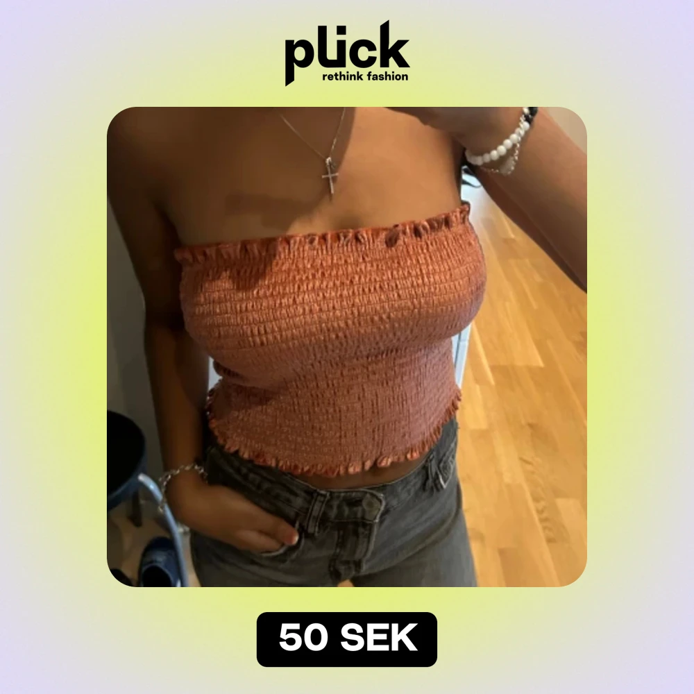 Säljer en superfin rostfärgad tubtopp. Den är stretchig i materialet och har en smockad design som gör att den sitter bra på plats. Toppen är lite croppad och har en söt volangkant både upptill och nedtill. Perfekt för sommaren eller en festkväll! Otroligt bekväm. Eftersom materialet är stretchig formas den efter din kroppstyp🧡