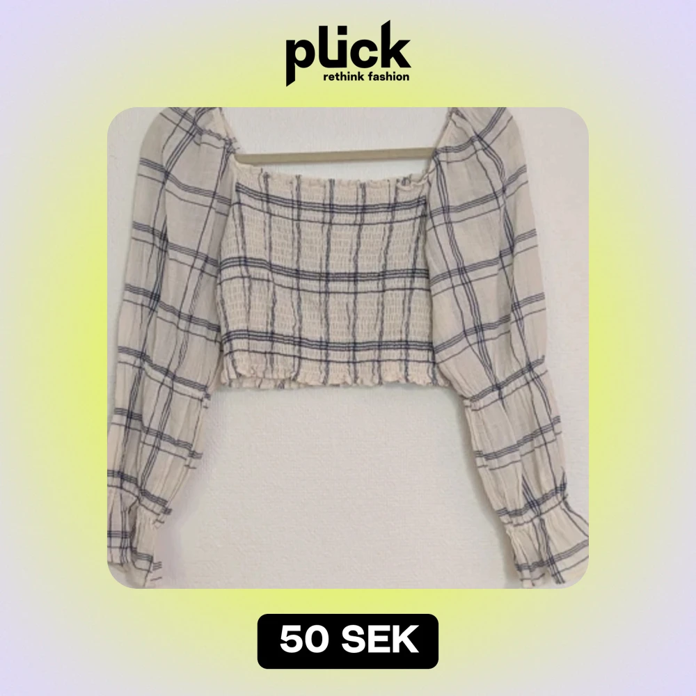 En rutig blus med långa ärmar. Blusen har en elastisk, rynkad design på kroppen med ihopdragningar på ärmarna. croptop. Färgerna är vit och blå rutigt