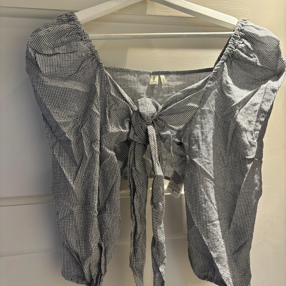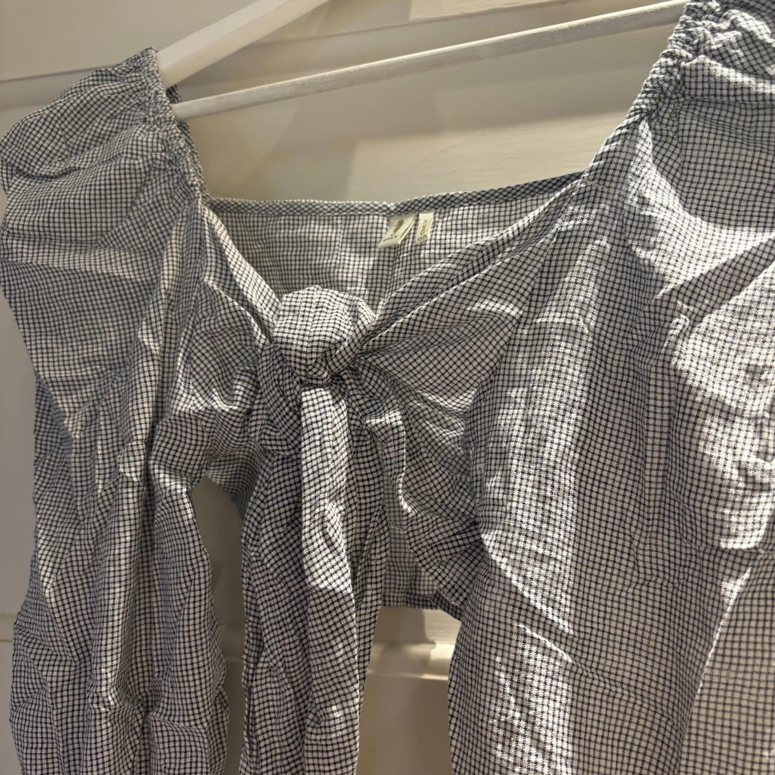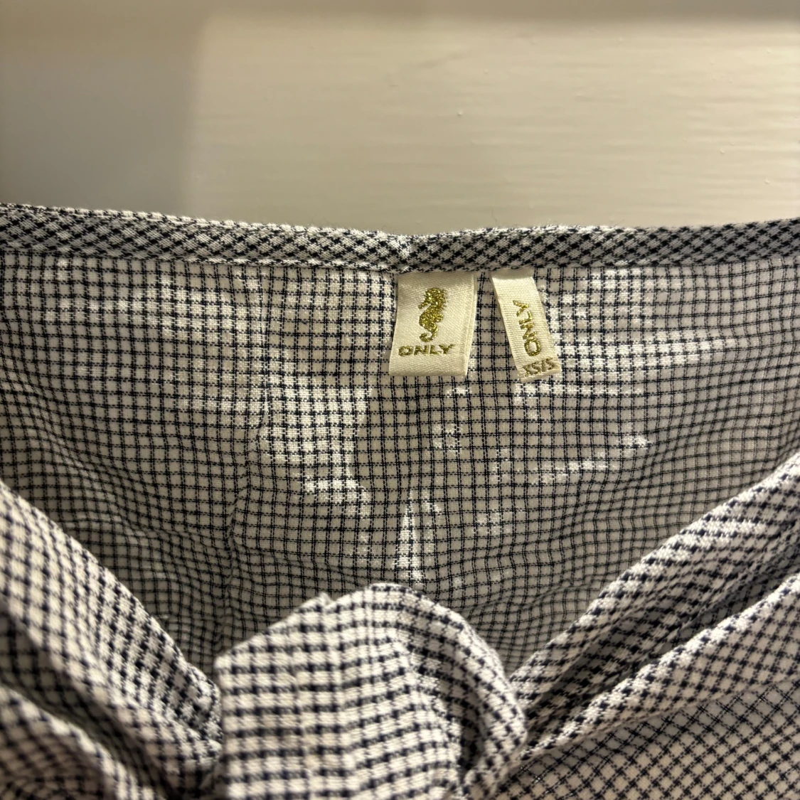 Säljer en blåvit rutig blus från ONLY i bomull. Toppen har trekvartsärmar, knytning framtill och en croppad passform. Perfekt för dig som gillar trendiga detaljer och en luftig känsla. Snygg till både jeans och kjol!
