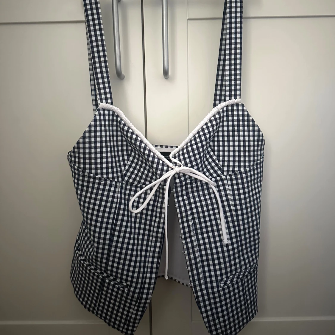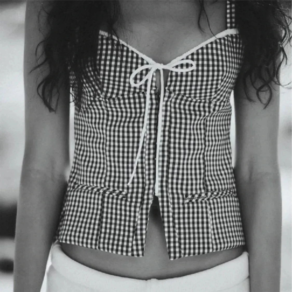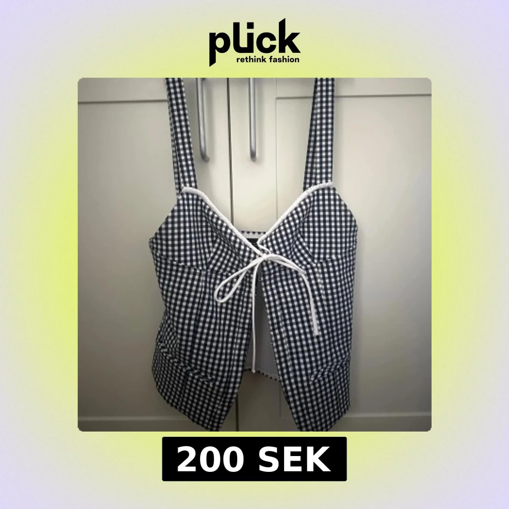 Snygg svartvit rutig korsettopp med breda axelband och vit snörning framtill. Toppen har en croppad passform och markerad midja, samt en liten slits framtill. Perfekt för dig som gillar trendiga och unika plagg.
