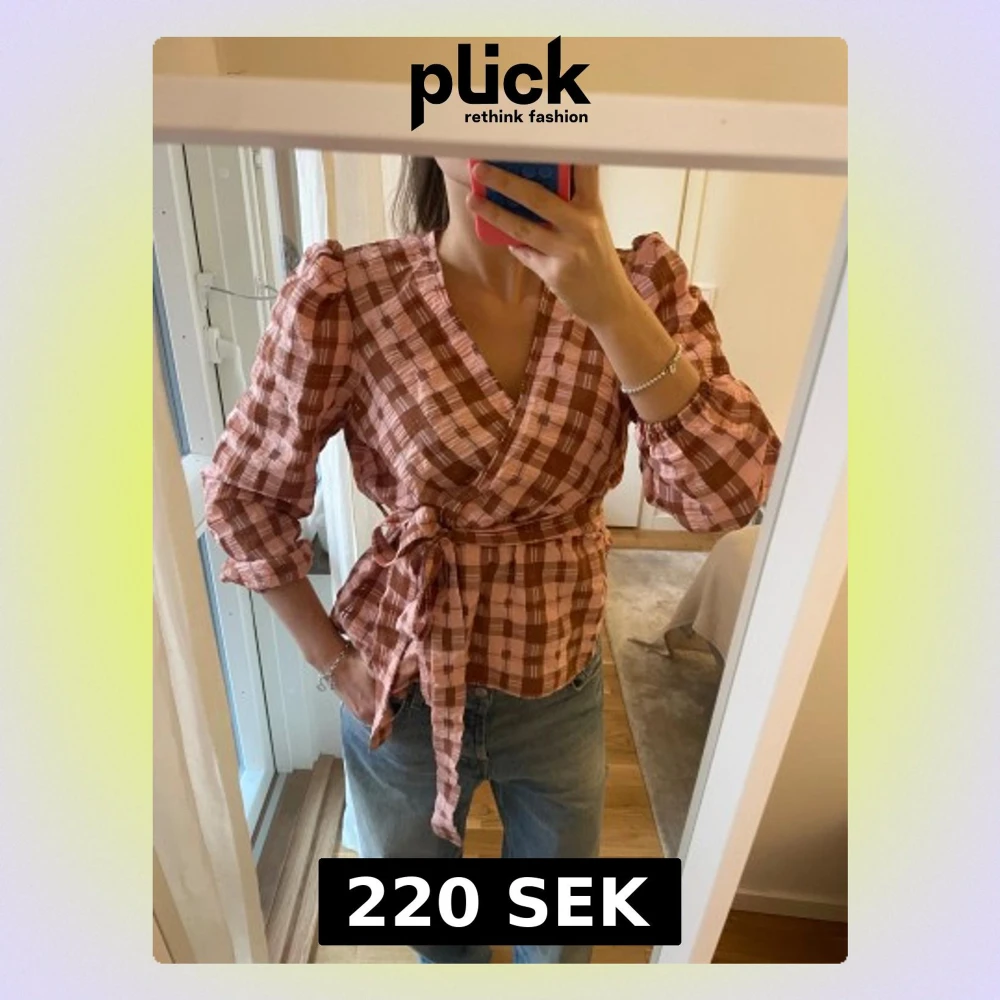 Säljer en rutig omlottblus i rosa och brunt med puffiga axlar och långa ärmar. Blusen har knytband i midjan och ett mjukt, krinklat bomullstyg som ger en chill vibe. Perfekt för dig som gillar statement-ärmar och snygga detaljer.