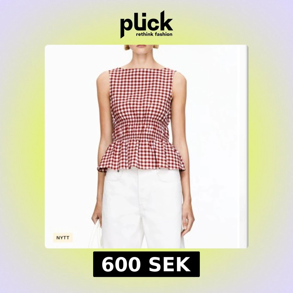 Superfin ärmlös blus i rödvitt rutigt mönster med smockad midja och volang nertill. Slutsåld överallt