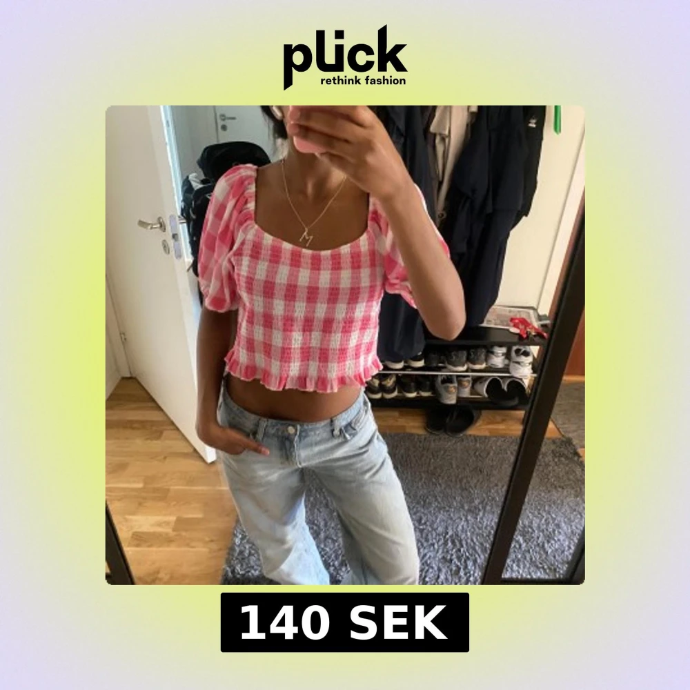 Superfin croppad blus i rosa och vitt med rutigt mönster och puffiga korta ärmar. Toppen har smockad struktur, volangkant nertill och kan bäras både på axlarna eller offshoulder. Perfekt för en söt och trendig sommarlook!