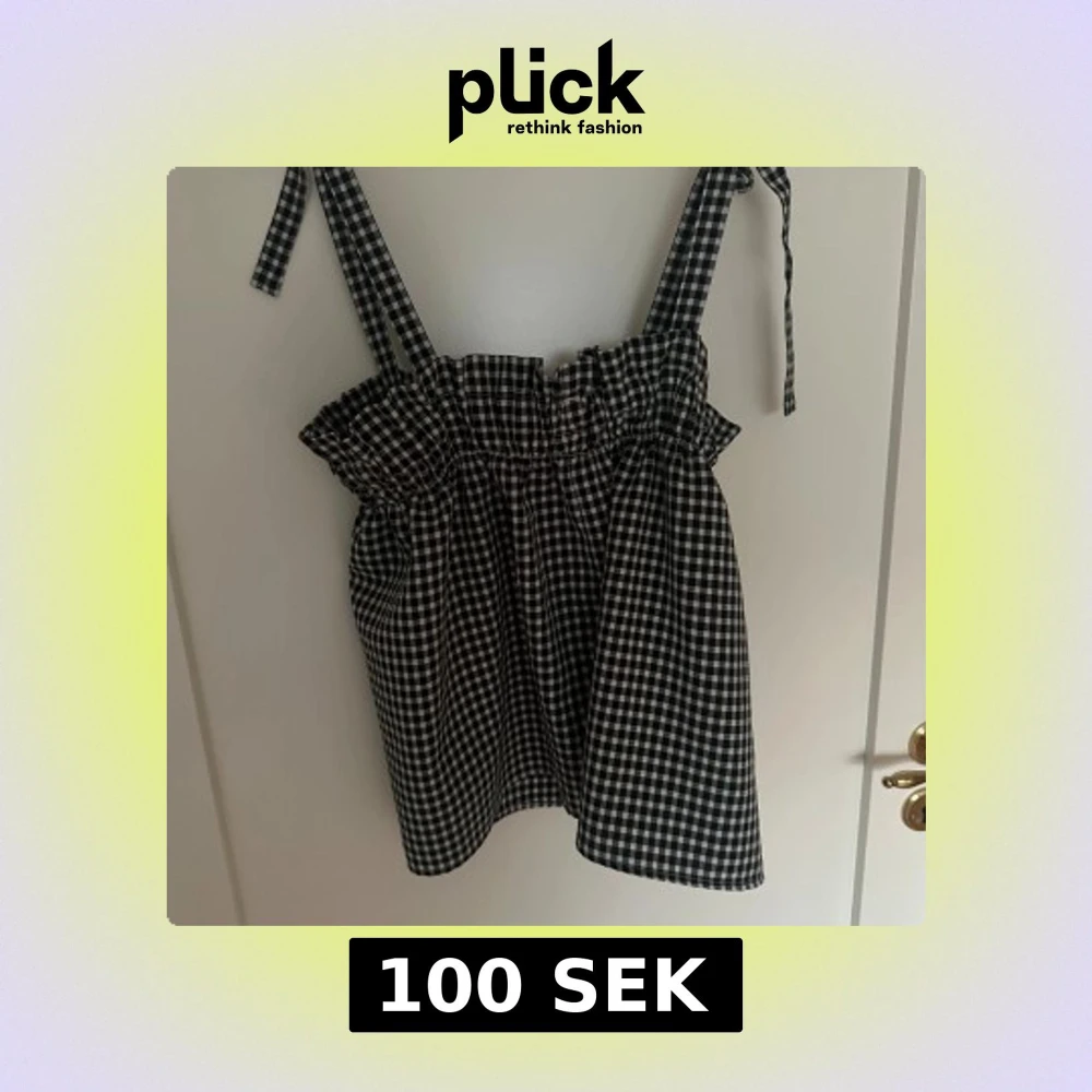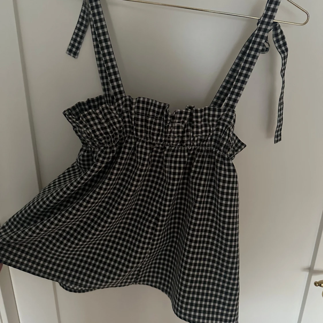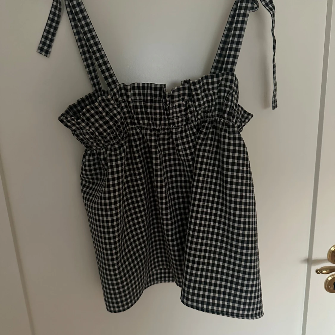 Supersöt linnetopp i svartvitt rutigt mönster med breda axelband som knyts upptill. Toppen har volangkant upptill.