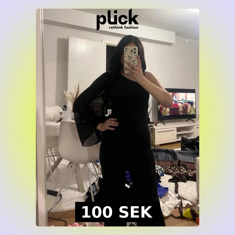 Säljer en svart oneshoulder jumpsuit med en lång, vid och transparent ärm. Storlek S