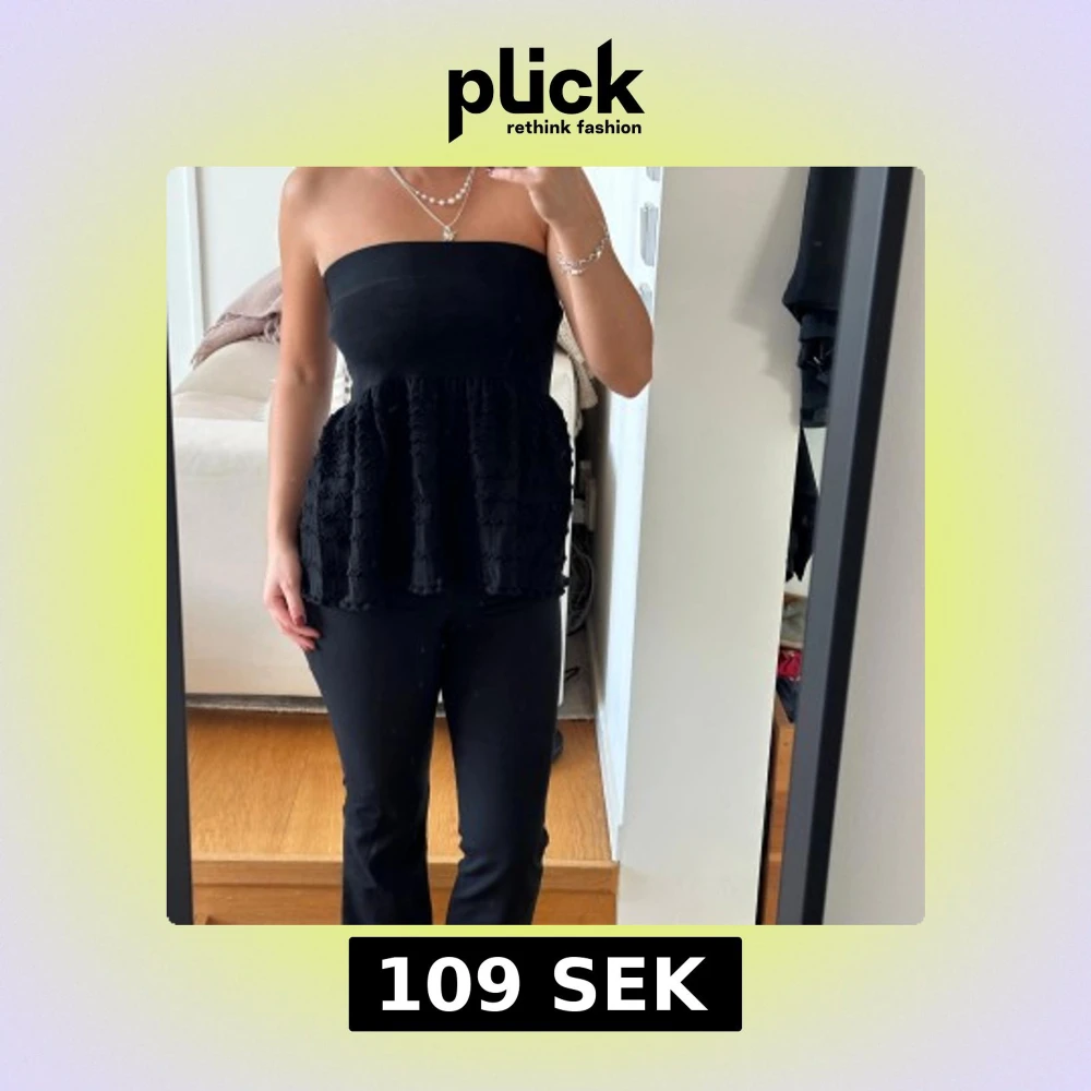 Säljer en svart bandeau tubtopp från BCBG Max Azria i storlek S. Toppen har en snygg volangdetalj med vågiga ränder nedtill och är axelbandslös. Väldigt bra kvalitet. Använd endast en gång!