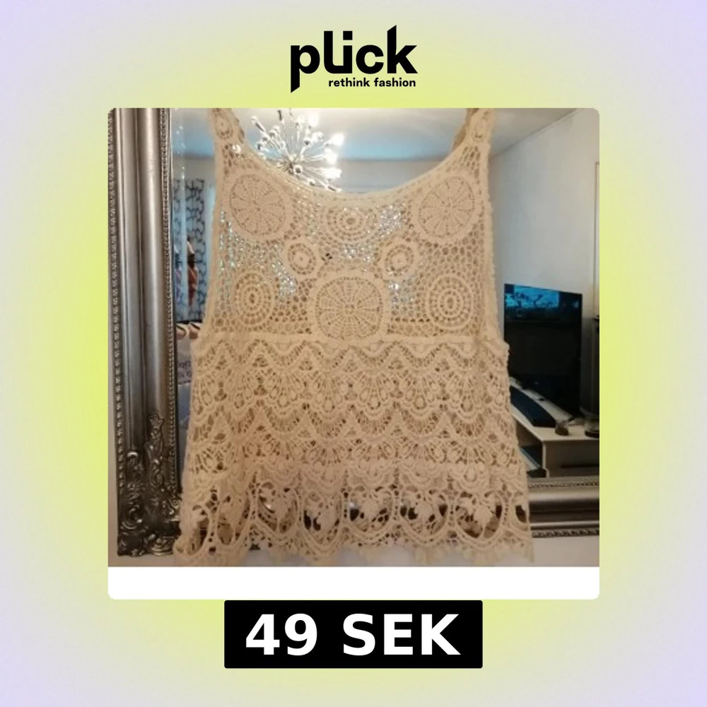 Superfin beige linnetopp med breda axelband och genomgående virkad spets. Toppen har ett unikt cirkelmönster upptill och vågiga spetskanter nedtill som ger boho-vibbar. Perfekt att styla över en enkel topp eller bikini för en chill look.
