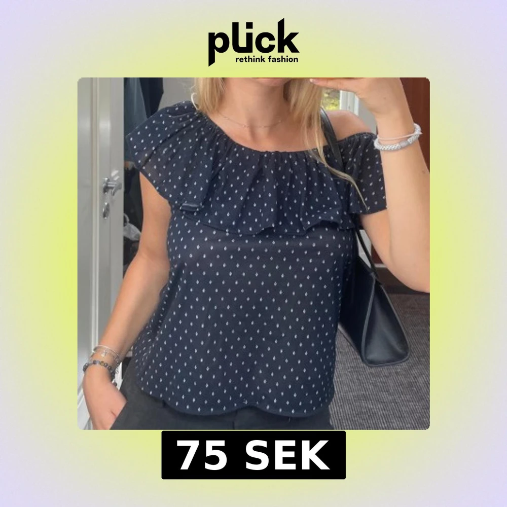 Supersöt mörkblå blus med offshoulder och volang runt halsen. Små vita mönster ger en fräsch känsla och toppen är luftig och perfekt för varma dagar. Kan bäras på olika sätt. Både över och under armarna.