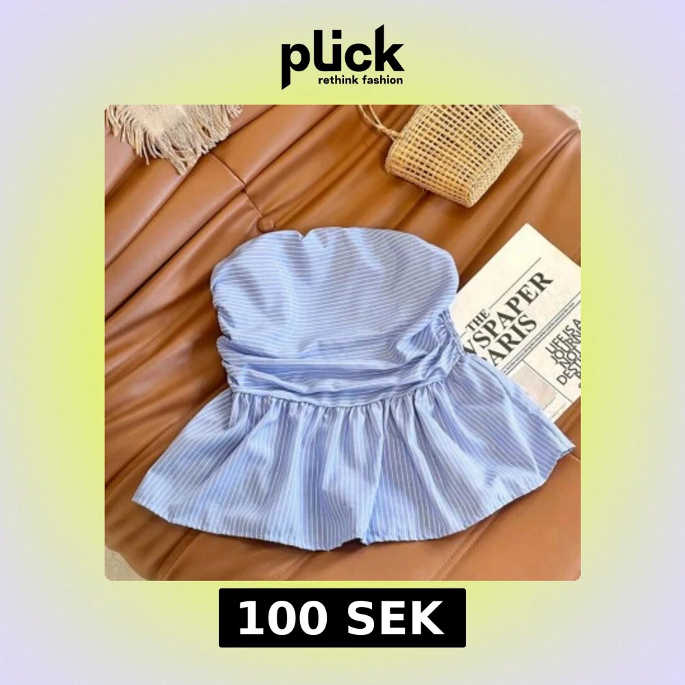 Supersöt bandeau tubtopp i blått med vita tunna ränder. Toppen har en volangig peplum-nederdel och är axelbandslös, perfekt för en somrig look. Materialet känns lätt och luftigt, vilket gör den extra bekväm.