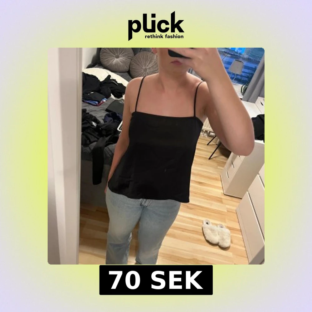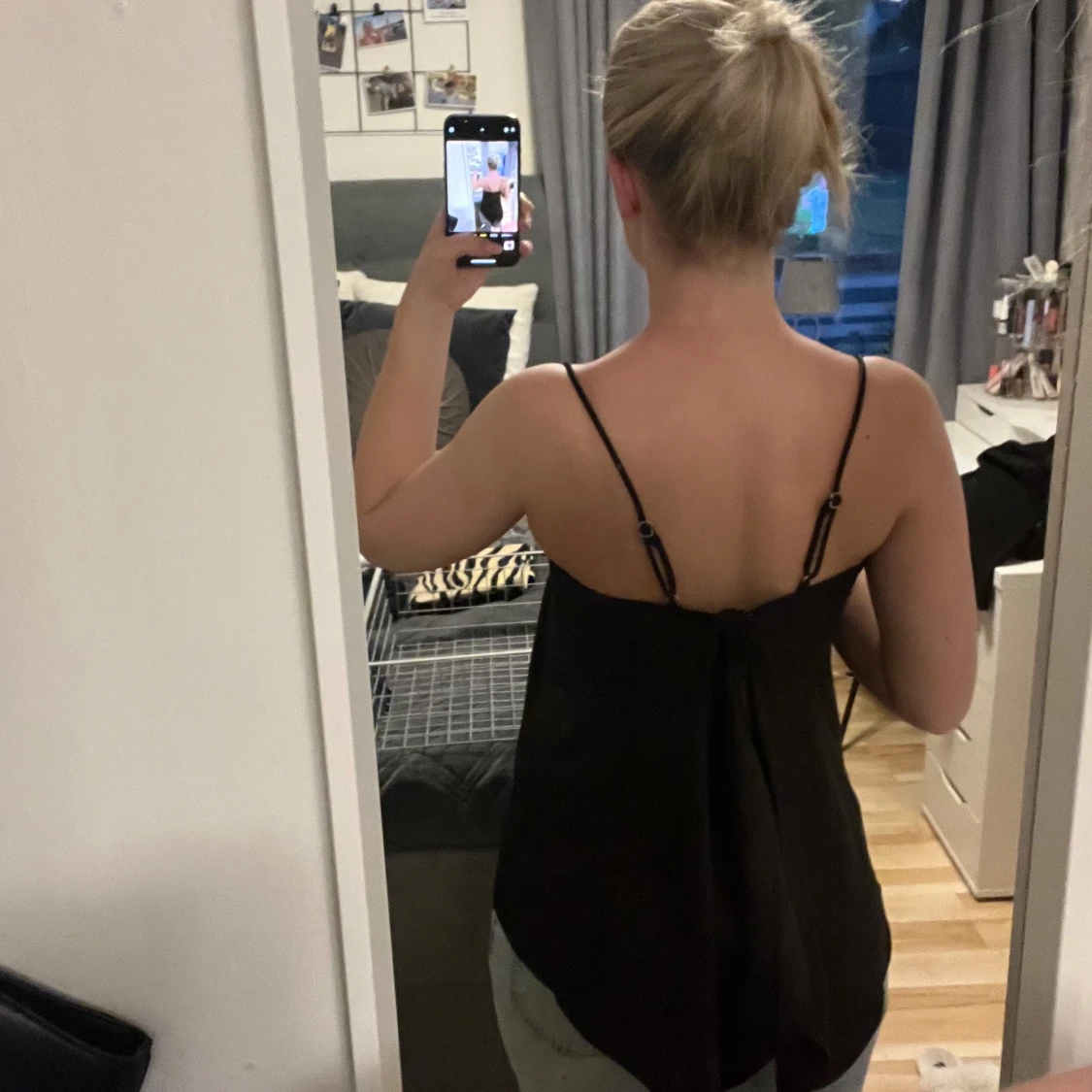 Säljer en svart linnetopp med tunna, justerbara axelband och rak halsringning. Toppen har en lös passform och är perfekt för varma dagar eller att styla lager på lager. Enkel och stilren design som funkar till mycket. Knyt själv i ryggen för att välja hur öppen rygg du vill ha. Från ginatricot.