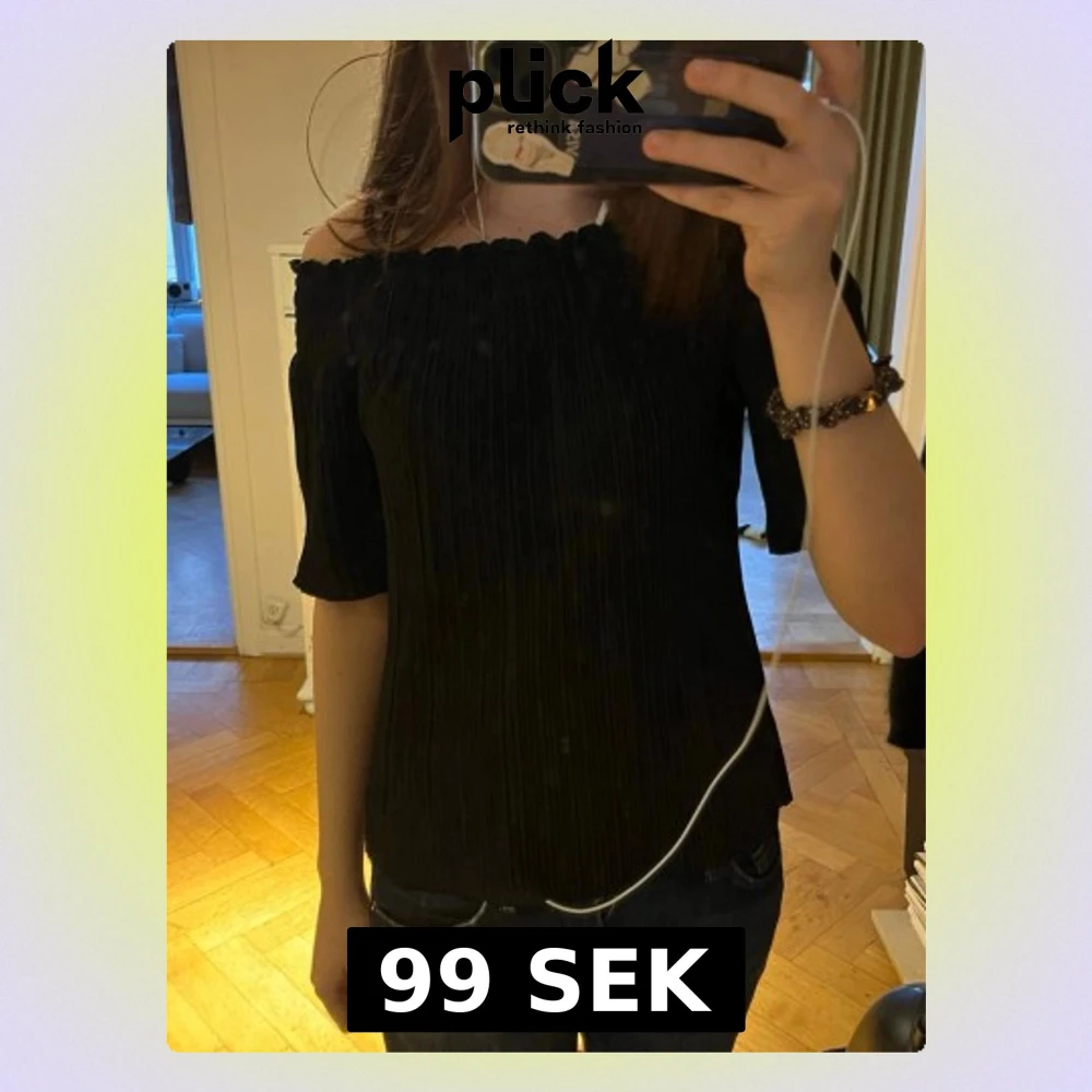 Säljer en svart offshoulder topp med plisserad struktur och korta ärmar. Toppen har en elastisk kant upptill som ger en snygg passform och trendig look. Perfekt för dig som vill ha en stilren och modern topp till garderoben.