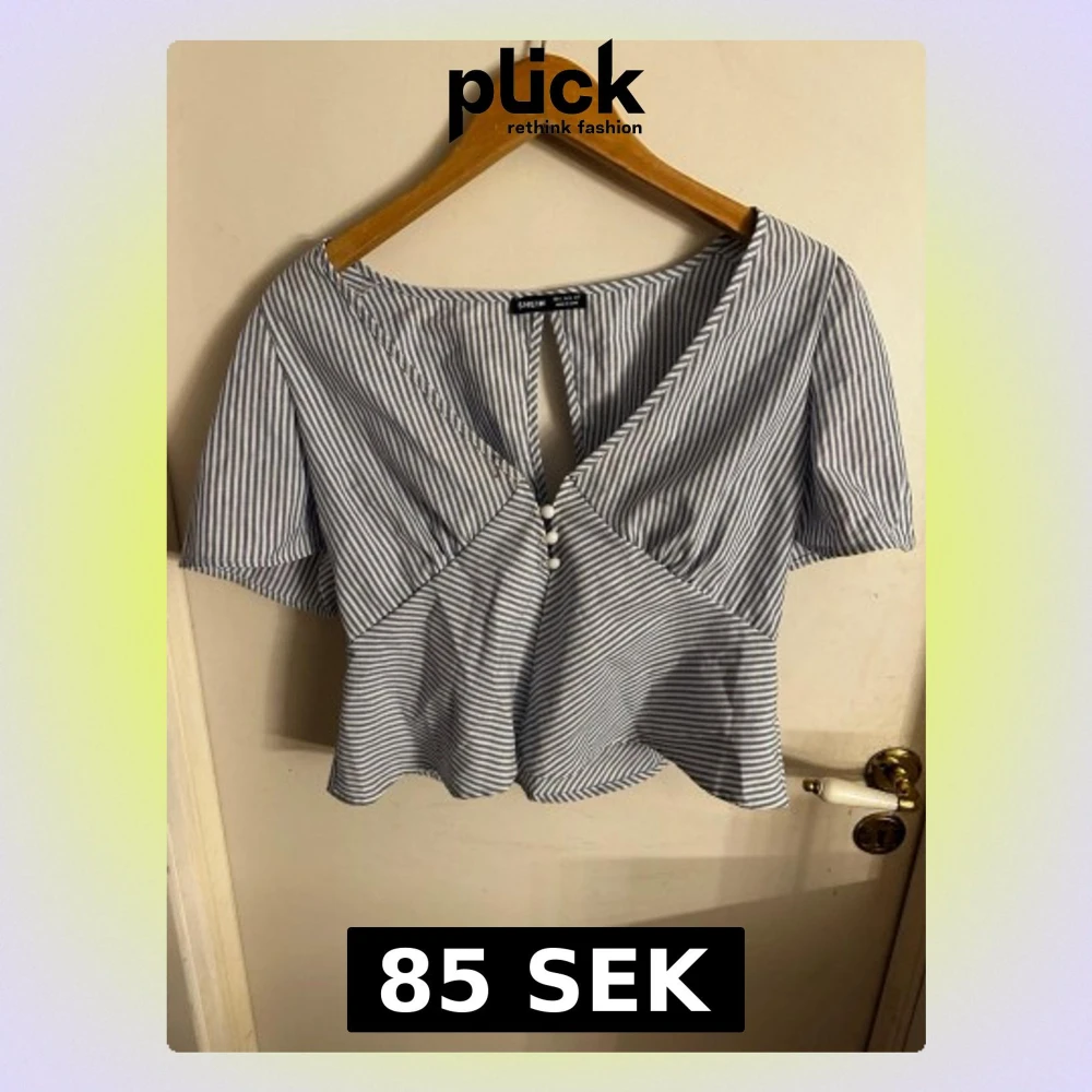 Blå- och vitrandig blus från SHEIN med puffärmar och feminina detaljer. V-ringning framtill med tre vita knappar samt djupare V-ringning i ryggen. Lätt utsvängd nederkant som ger en fin passform. Somrig, söt och romantisk stil – perfekt till jeans eller kjol.