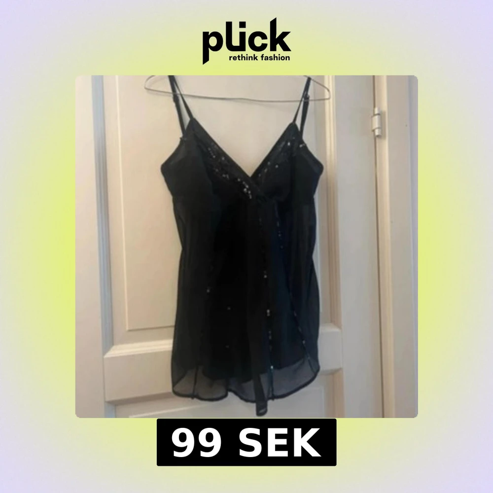 Snyggt svart linne med smala axelband och paljettdetaljer framtil. Det är ett transparent tyg och inget lager under det.