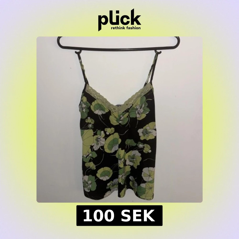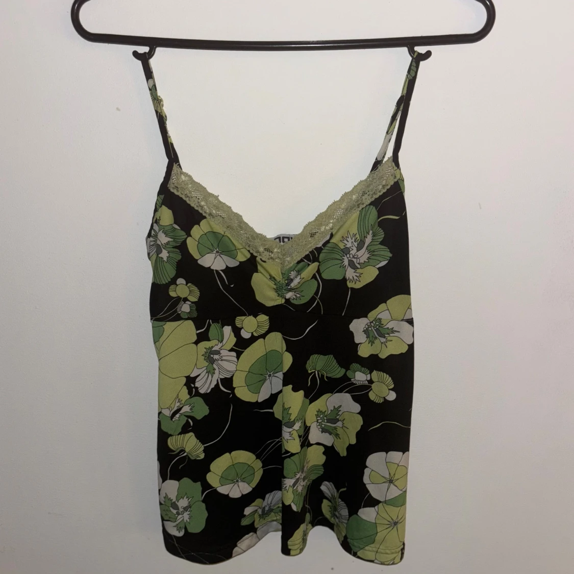 Snygg linnetopp med grönt och vitt blommönster på svart botten. Toppen har tunna axelband och en v-ringad hals med grön spetskant som ger en extra detalj. Perfekt för dig som gillar en feminin och trendig stil.