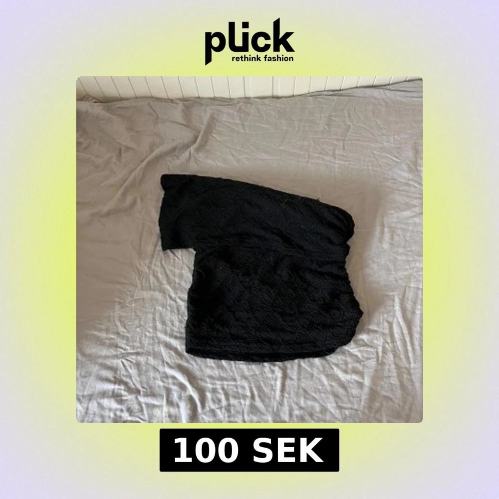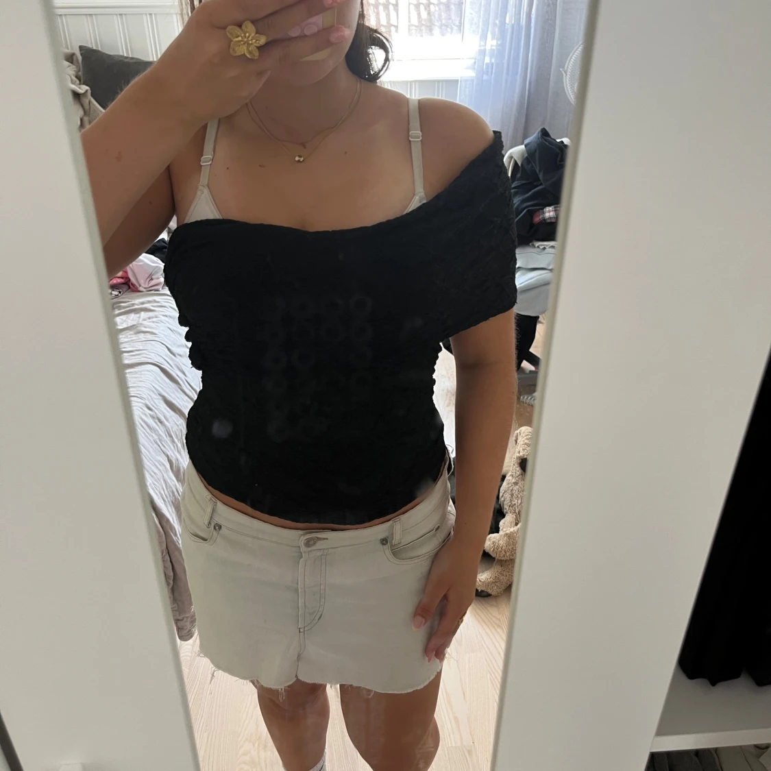 Säljer en svart offshoulder topp med snyggt spetsmönster. Toppen är croppad och har en figurnära passform som framhäver siluetten. Ingen lapp då jag köpte begagnat