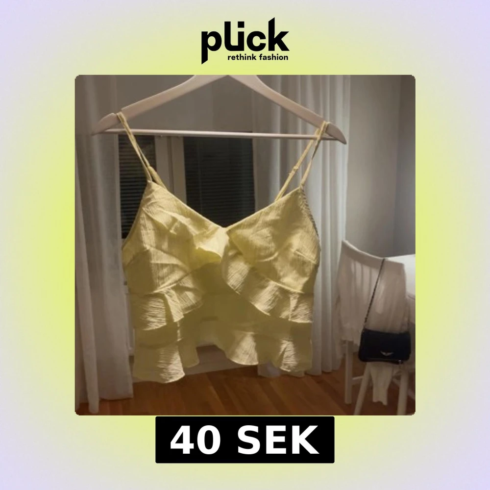 Säljer en ljusgul linnetopp från SHEIN med tunna axelband och flera volanglager. Toppen har en lätt skrynklig struktur och är perfekt för varma dagar. Snygg och luftig modell som ger en somrig vibe.
