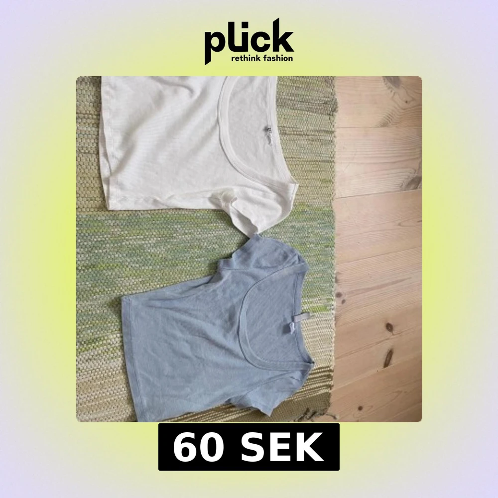 Säljer två croppade ribbade toppar från H&M Divided i storlek S och xs. En är vit och en är ljusblå, båda med kort ärm och rundad, djup urringning. Perfekta för sommaren och lätta att matcha med jeans eller kjol. Den blå har en fläck vid urringningen. Säljer båda för 60 eller 40 var