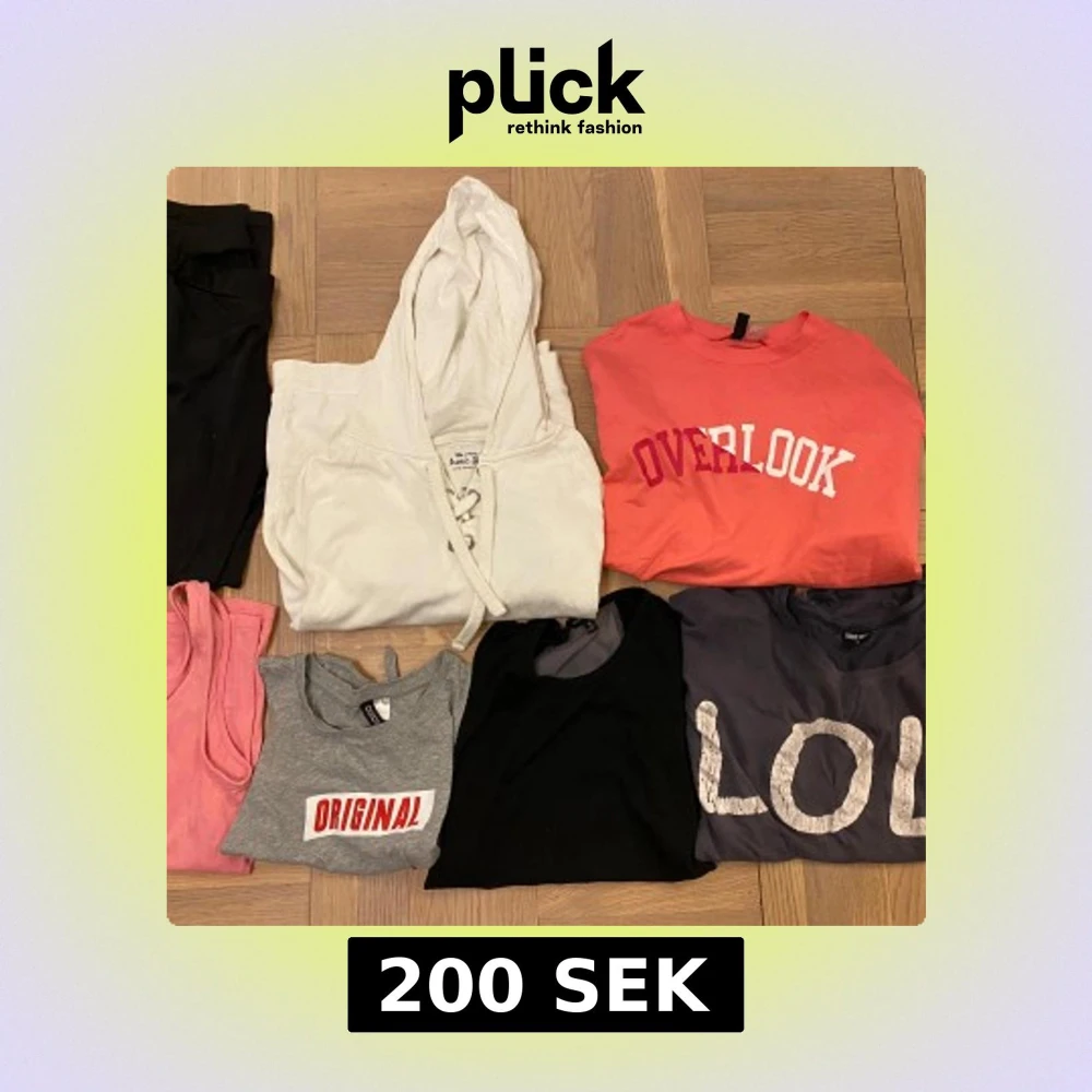 Klädpaket i stl. S! Innehåll: Glansiga svarta tights. Vit hoodie med snörning upptill. Rosa tjocktröja med tryck. Rosa linne. Grå T-shirt med tryck. Svart linne med grå rygg. Grått linne med knytning.