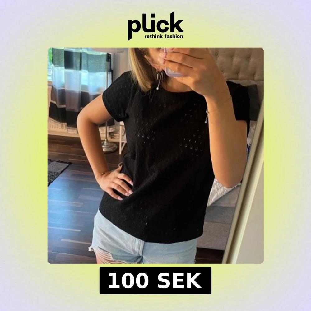 Svart blus från Jyothi i storlek S. Toppen har korta ärmar och är tillverkad i ett hålmönstrat tyg som ger en luftig känsla. Passformen är normal och toppen är perfekt att styla med jeans eller kjol💙