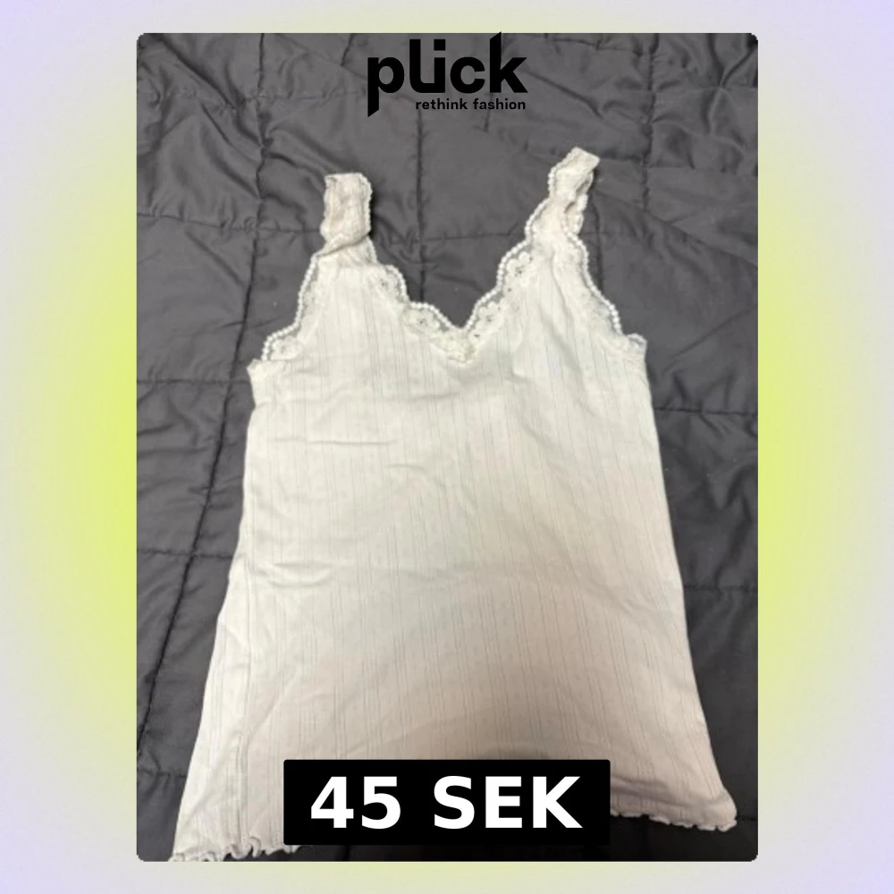 Söt vit linnetopp från Cubus med tunna vertikala ränder och spetsdetaljer längs urringning och axelband. Toppen har en v-ringad form och små volangkanter nedtill. Storlek S