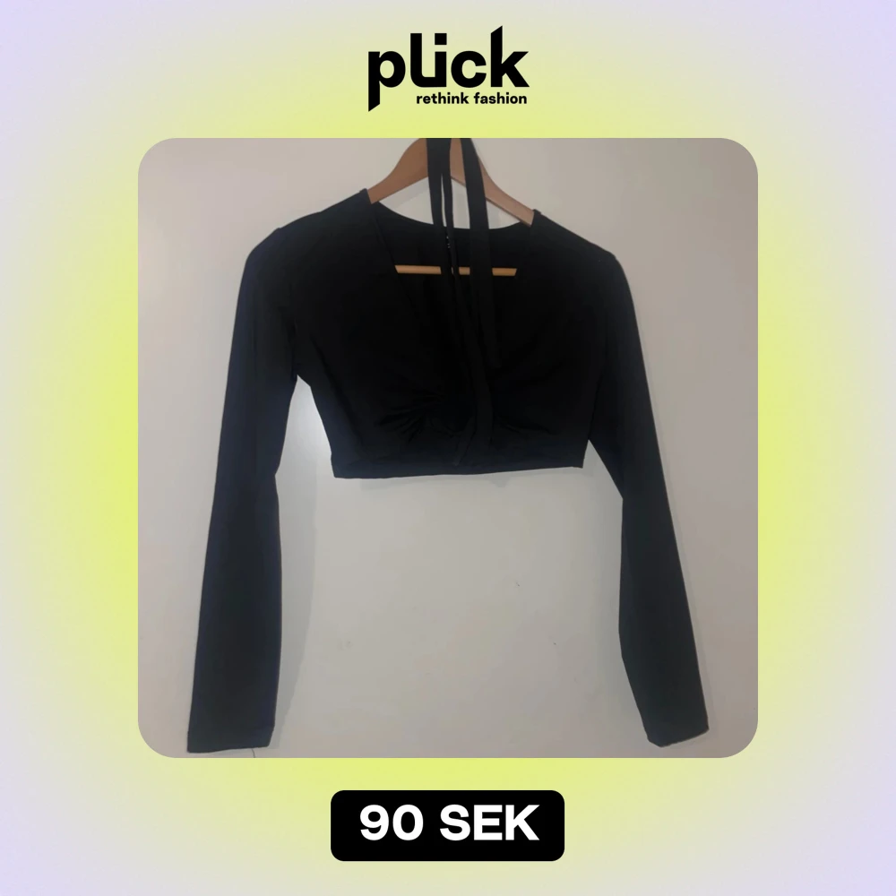 Snygg svart croppad topp från Shein i storlek S. Den har långa ärmar och en cool knytdetalj framtill med en ring som ger en unik look. Perfekt för en utekväll eller fest!