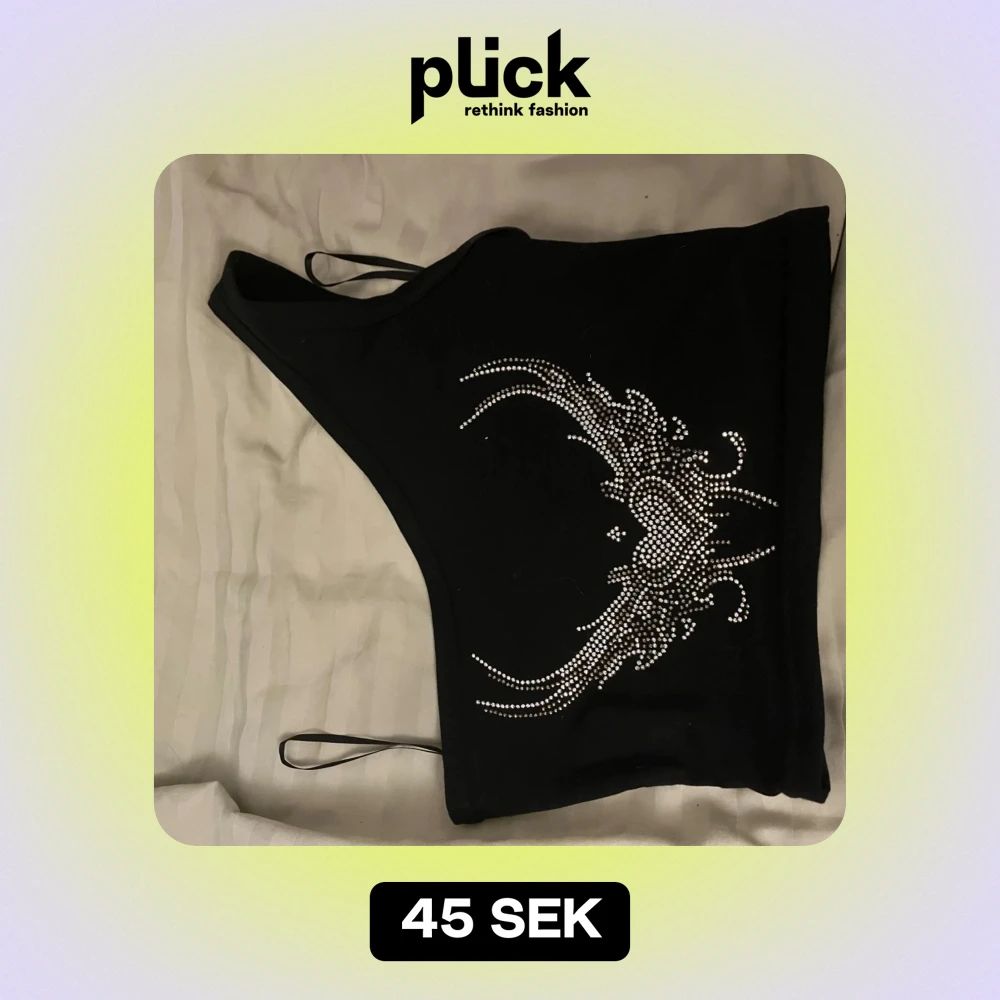Snygg svart oneshoulder topp med glittrande strassdetaljer framtill. Perfekt för en utekväll eller fest! Den har en tight passform och tunna axelband som ger en elegant look. Toppen är croppad och passar bra till både jeans och kjol.