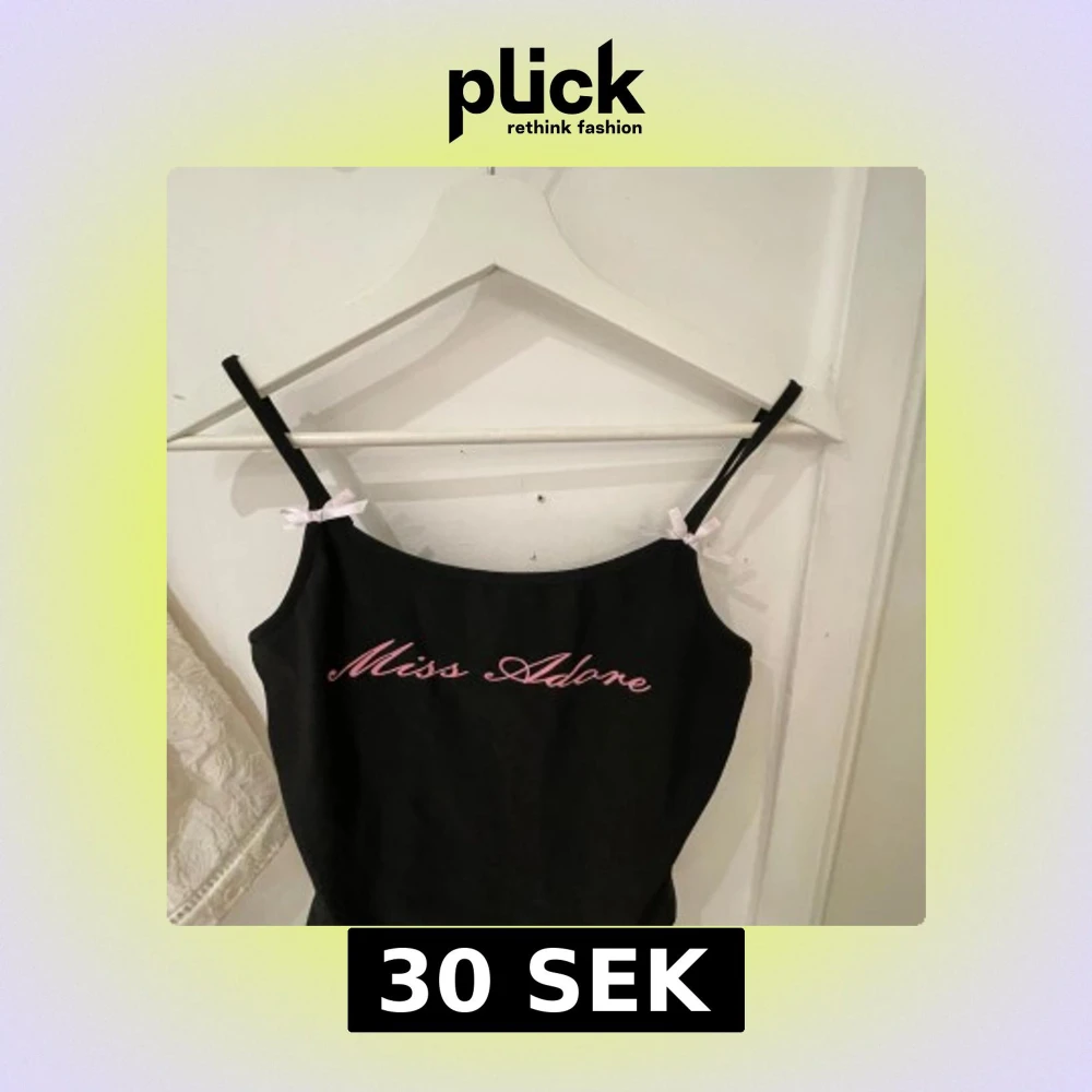 Säljer en svart linnetopp med tunna axelband och rosa rosetter. Framtill står det 'Miss Adore' i rosa text. Perfekt för en trendig och söt look. Storlek S