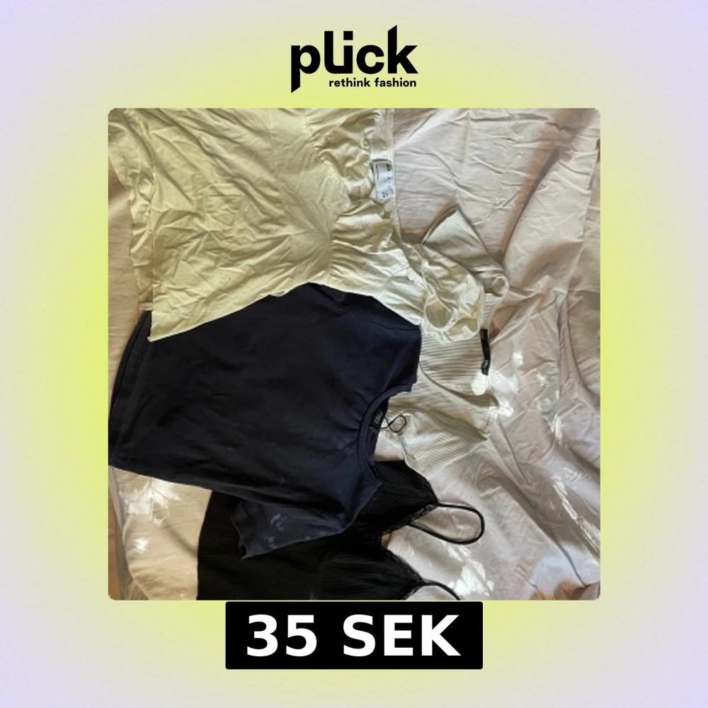 Säljer tre toppar: en beige croppad topp med knytning bak , en svart ribbad linnetopp med smala axelband och en vit ribbad topp med kort ärm. Marin blå cropped T-shirt. Perfekta för sommaren och lätta att matcha. 35kr/t-shirt 100kr för alla