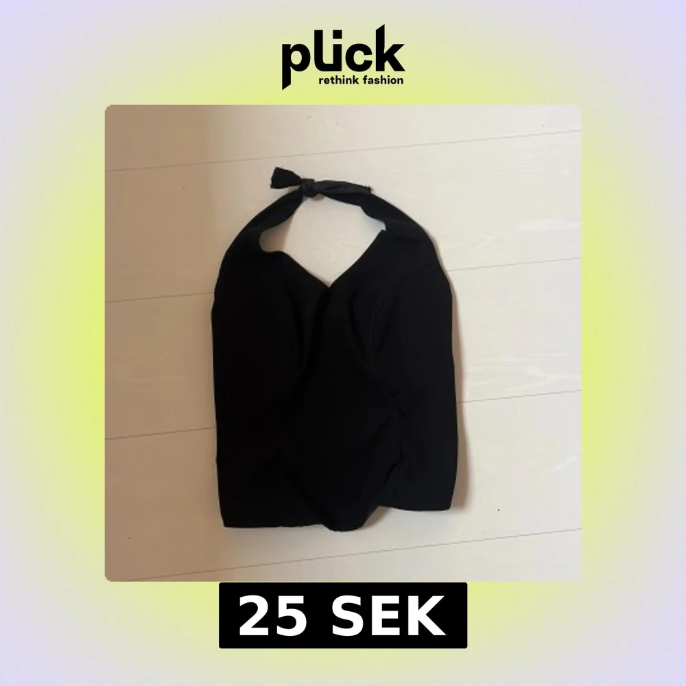 Snygg svart korsett-topp med halterneck och knyt i nacken. Toppen har en figurnära passform och smockad baksida för extra komfort. Perfekt för dig som vill ha en stilren och trendig look. Skulle uppskatta storleken som s/m