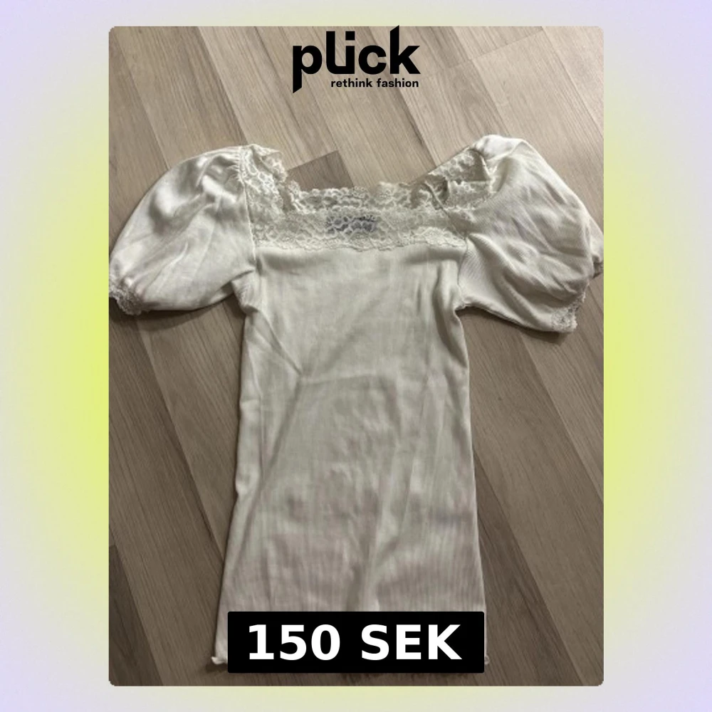Supersöt vit topp med puffiga korta ärmar och spetsdetaljer vid halsringningen. Ribbad struktur i tyget och lätt volangkant nertill. Aldrig använt och känner att den inte passar på mig och att den inte är i min stil