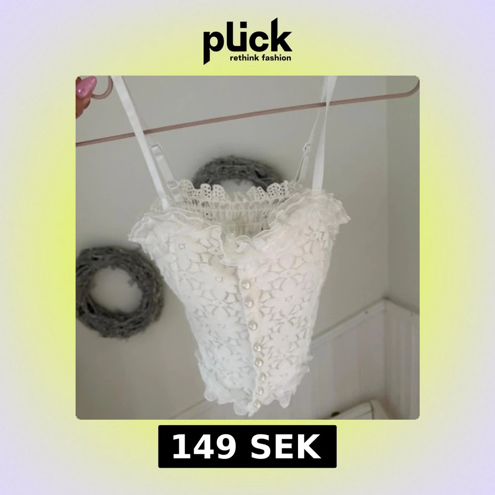Supersöt vit korsettopp med blommig spets, volangkant upptill och pärlknappar framtill. Smala axelband och romantisk känsla, perfekt för dig som gillar detaljer och vintage vibes.