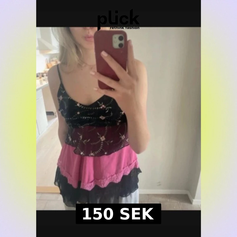 Söt linne-topp med tunna axelband och flera lager volanger. Överdelen är svart med broderade blommor i rosa och grönt, underdelen har rosa och svarta lager med spetsdetaljer. Luftigt material, perfekt för varma dagar och en trendig Y2K-vibe.